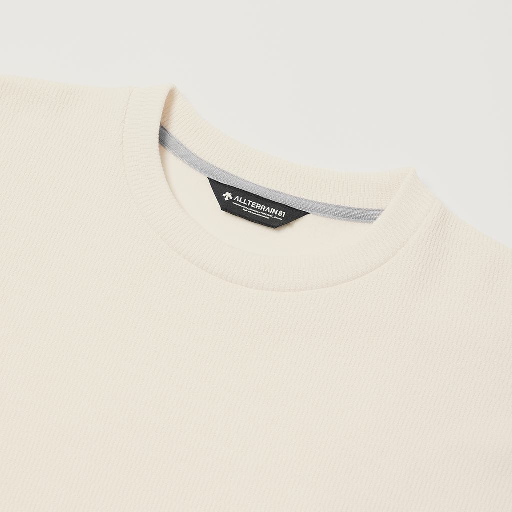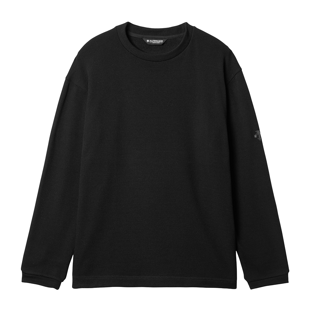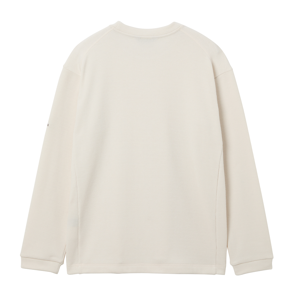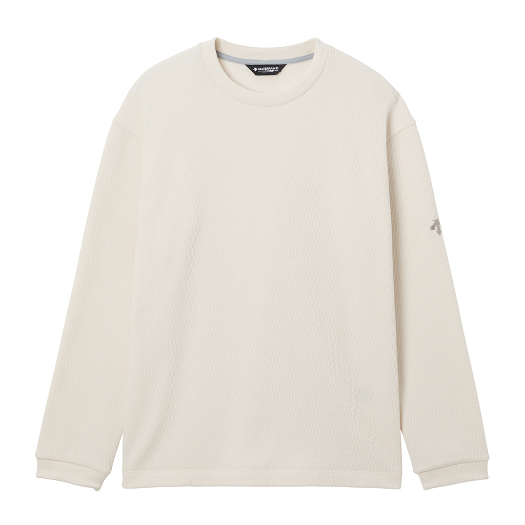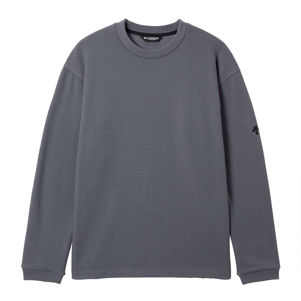 A crew neck pullover in a thick, textured fabric with a velour-like brushed inner surface for warmth and comfort. The relaxed fit makes it suitable for various outdoor activities and everyday use.
