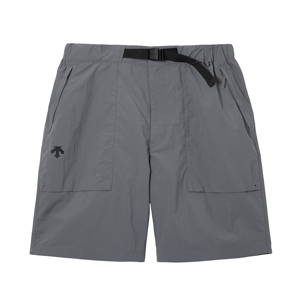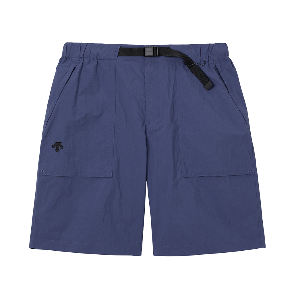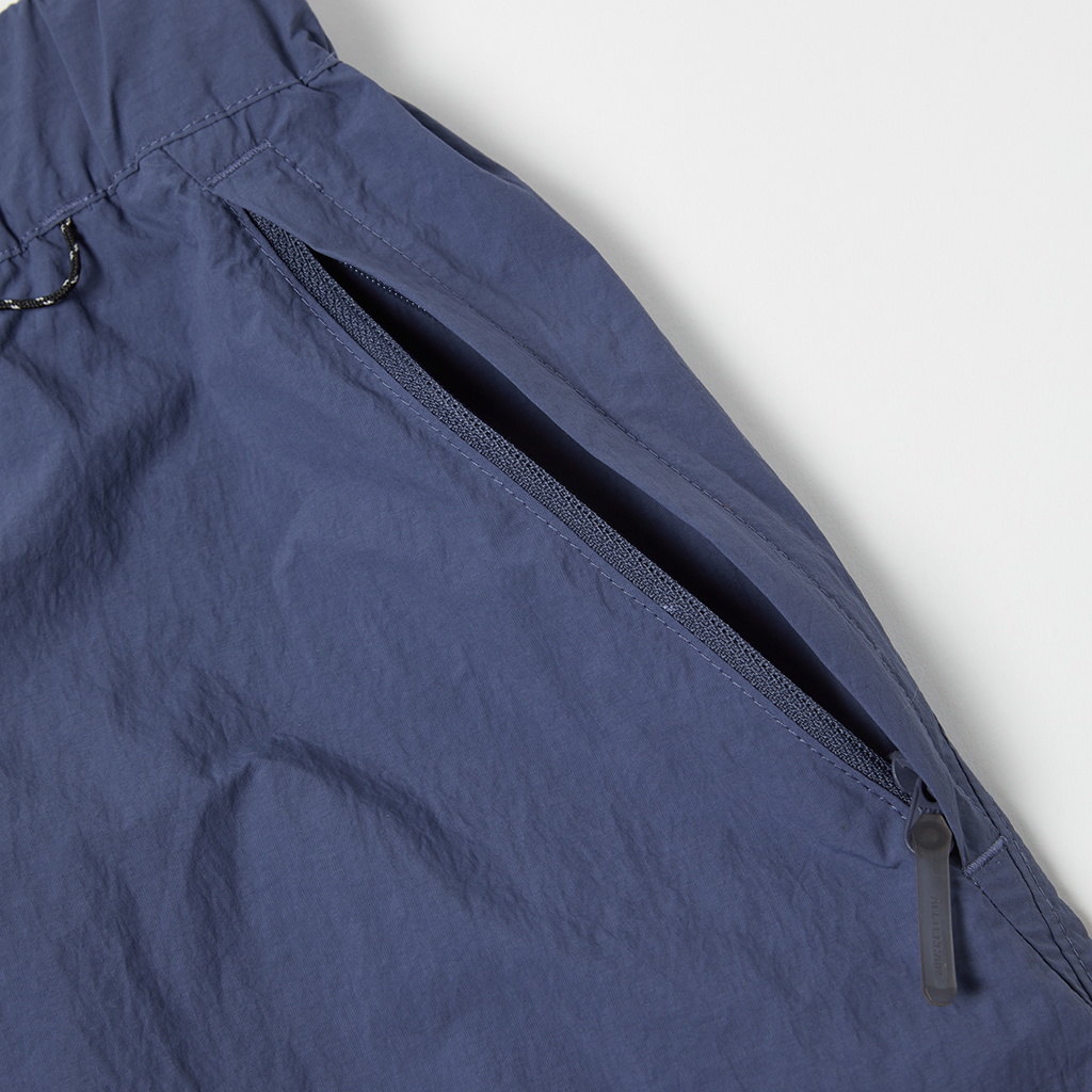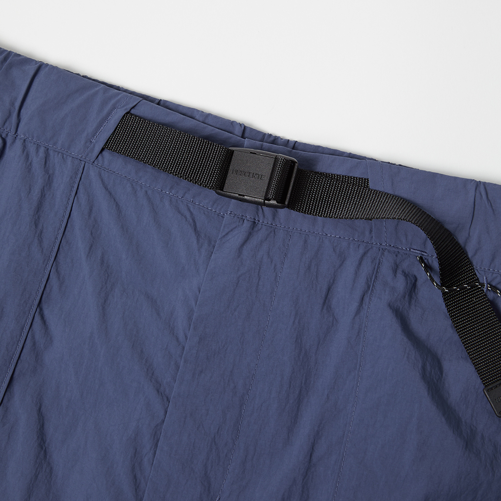 Lightweight Taslan nylon shorts. Water repellency is achieved with a CO treatment, free from decomposition-resistant fluorine compounds. The front closes with a button-and-zipper and a waist belt allows easy adjustment. Suitable for both outdoor activities and everyday wear.