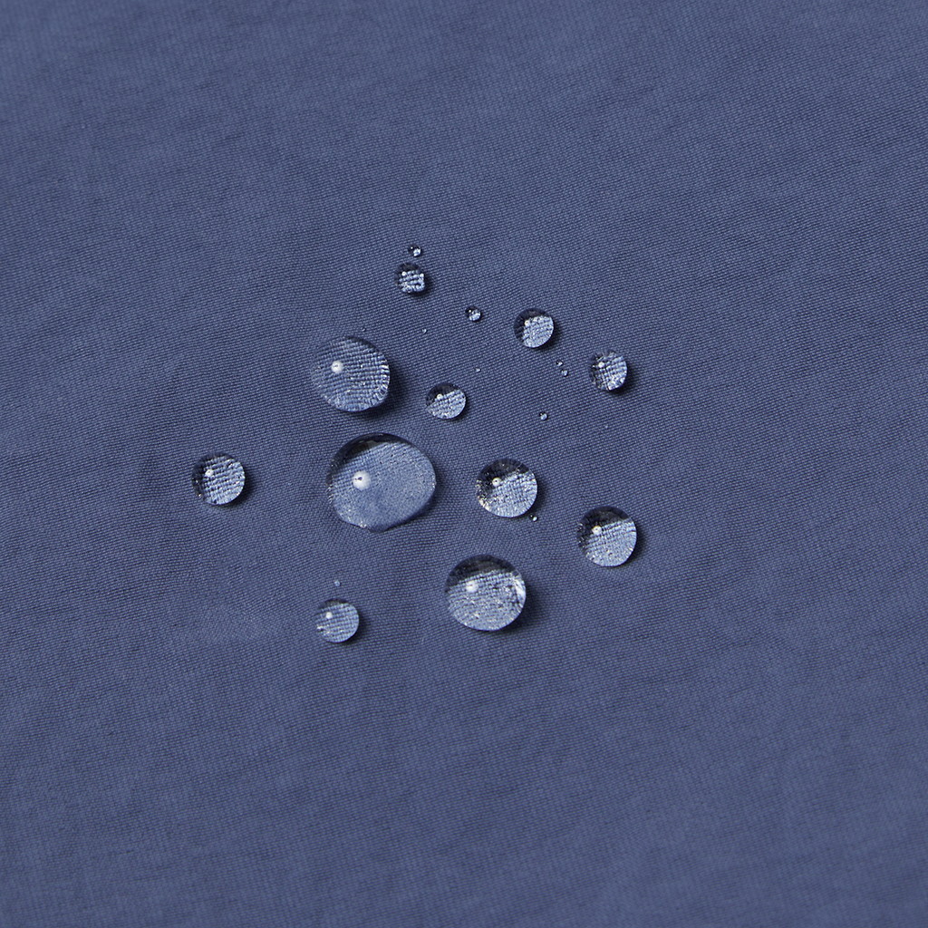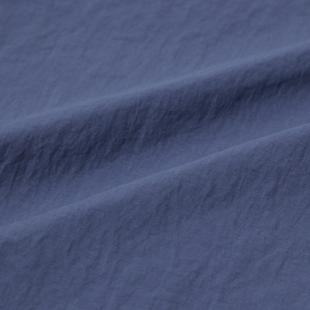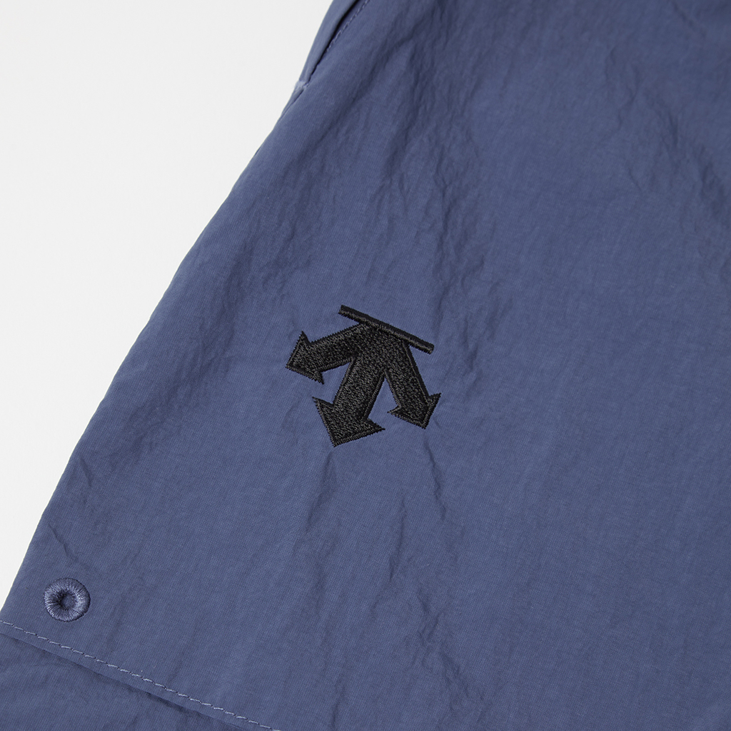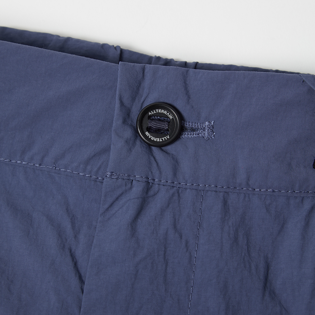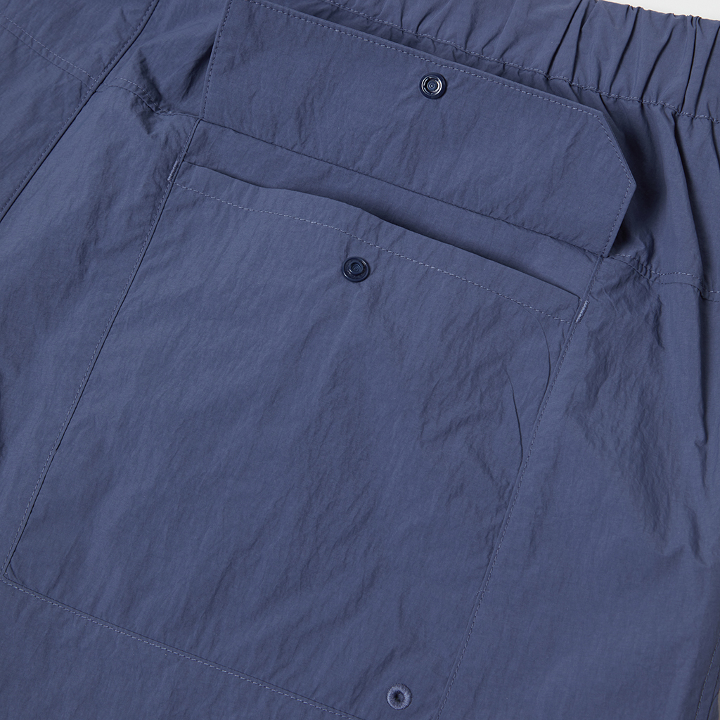 Lightweight Taslan nylon shorts. Water repellency is achieved with a CO treatment, free from decomposition-resistant fluorine compounds. The front closes with a button-and-zipper and a waist belt allows easy adjustment. Suitable for both outdoor activities and everyday wear.