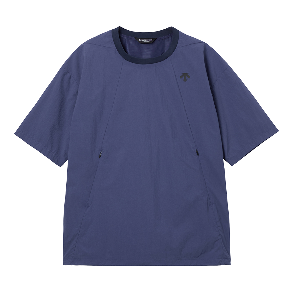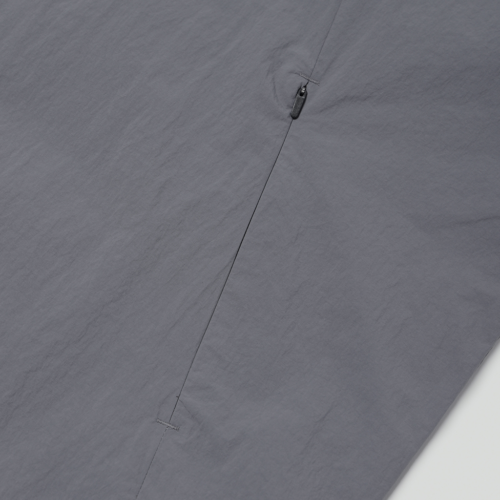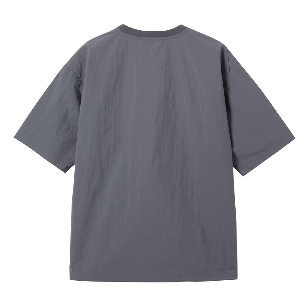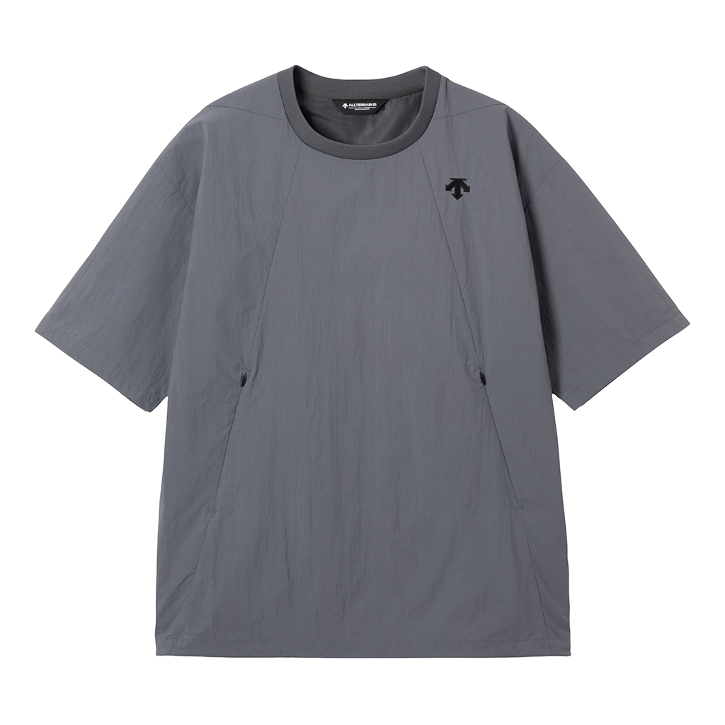A short sleeve T-shirt in lightweight Taslan nylon. Water repellency is achieved with a CO treatment, free from decomposition-resistant fluorine compounds. It has two zippered pockets on the front and an adjustable hem with rubber spindles and stoppers. Suitable for both outdoor activities and everyday wear.