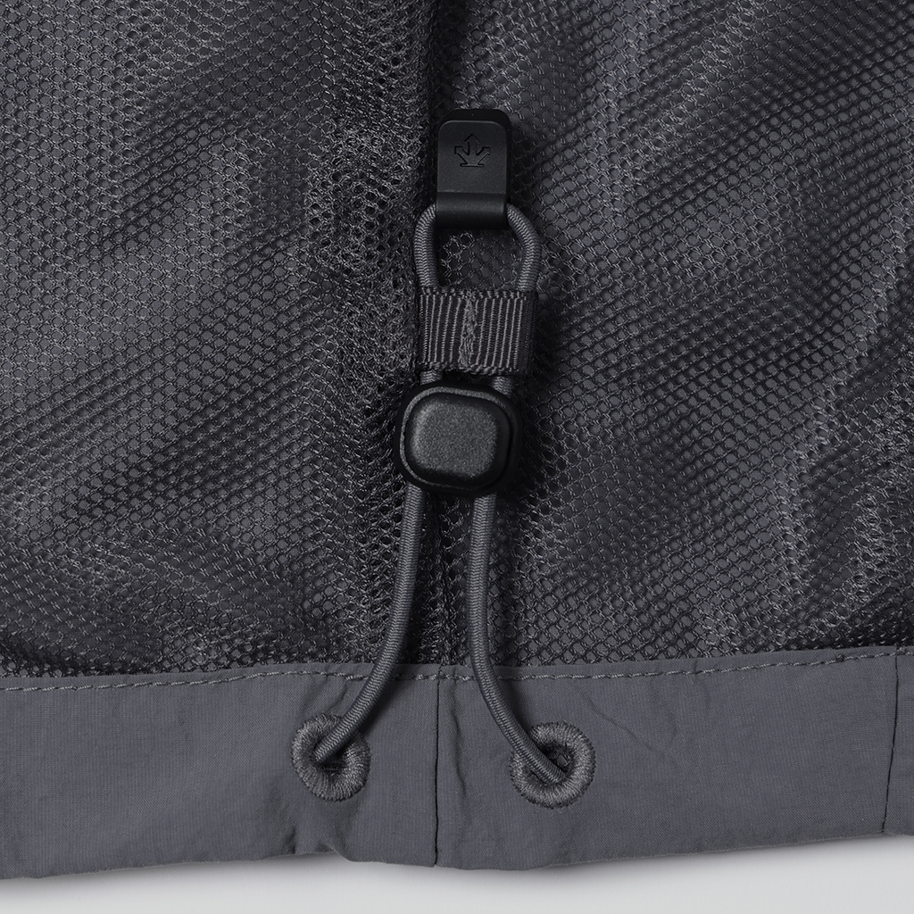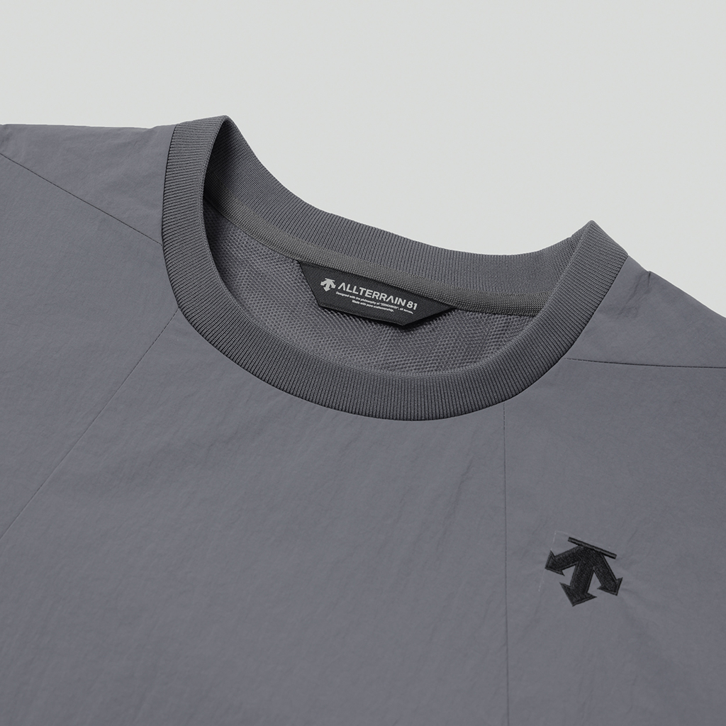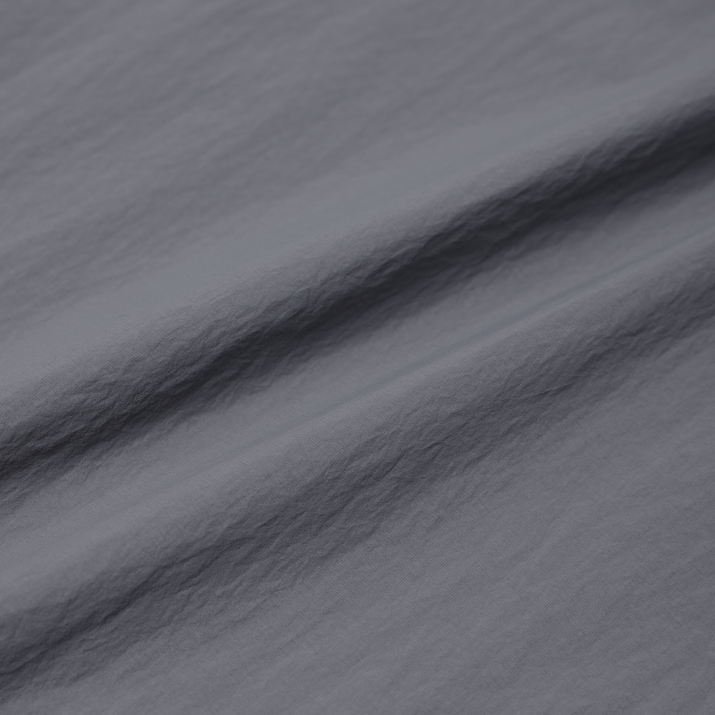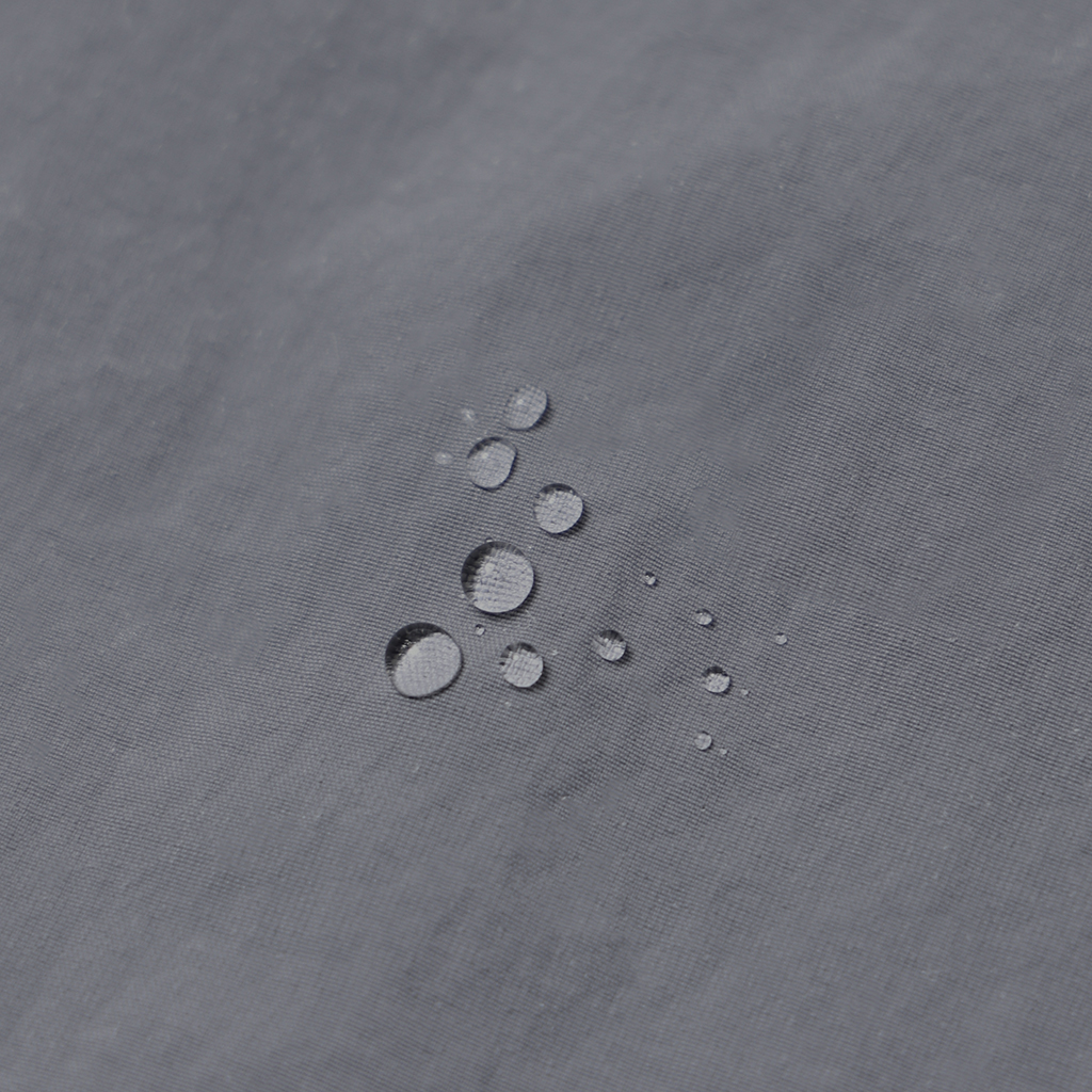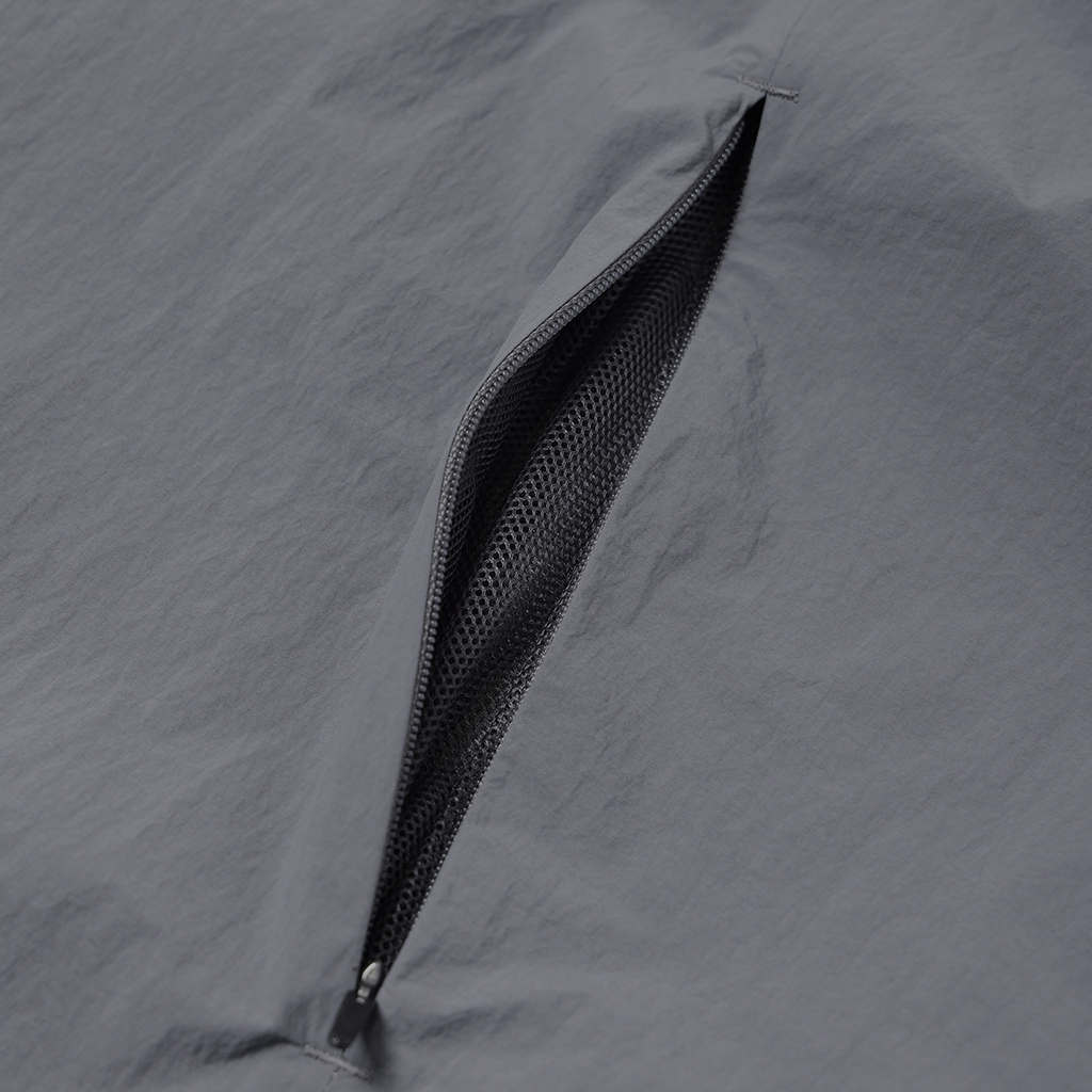 A short sleeve T-shirt in lightweight Taslan nylon. Water repellency is achieved with a CO treatment, free from decomposition-resistant fluorine compounds. It has two zippered pockets on the front and an adjustable hem with rubber spindles and stoppers. Suitable for both outdoor activities and everyday wear.