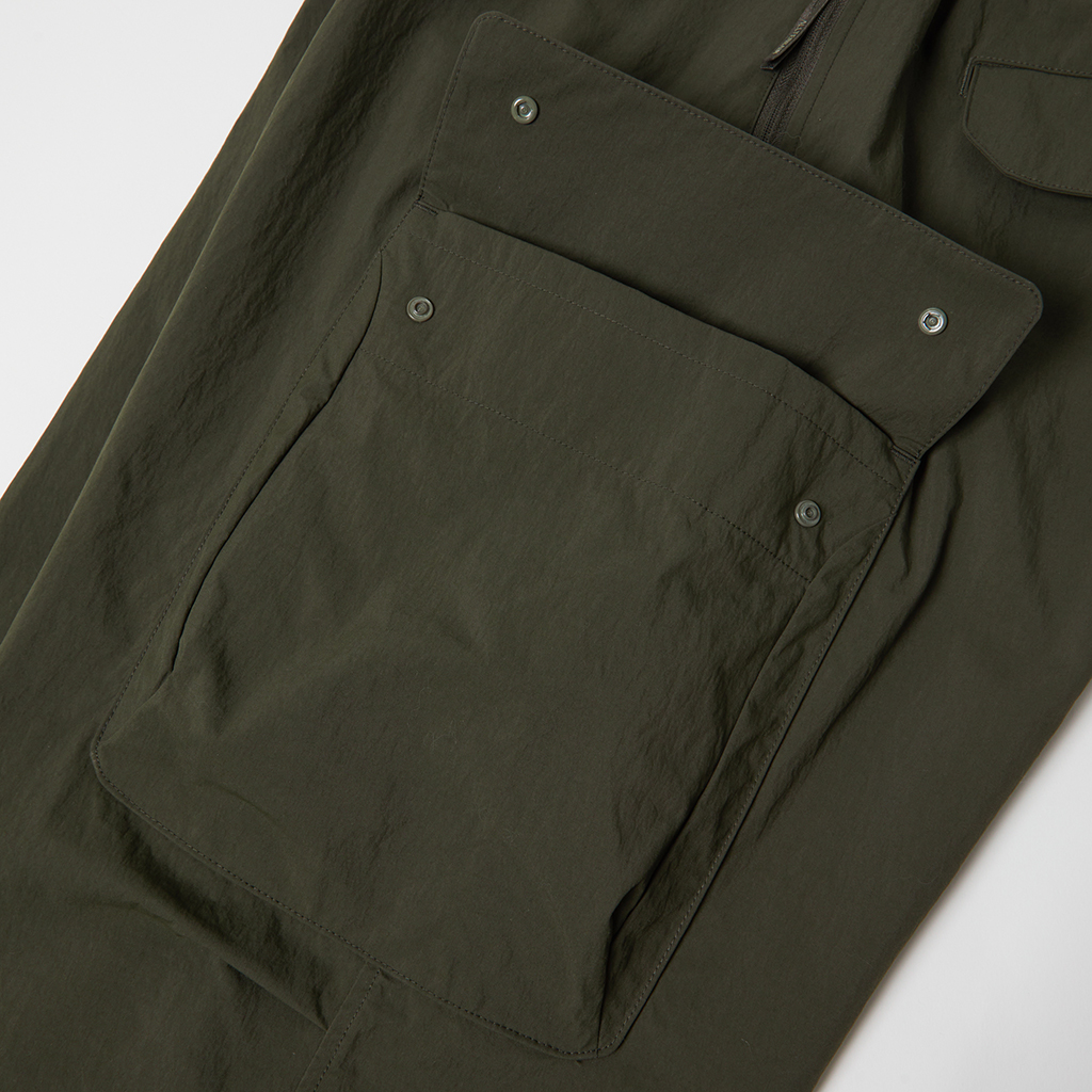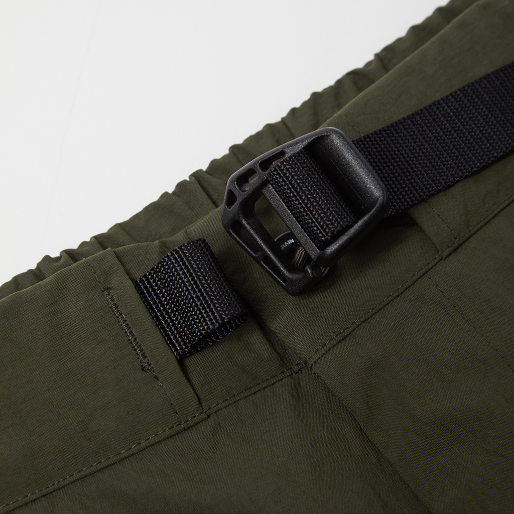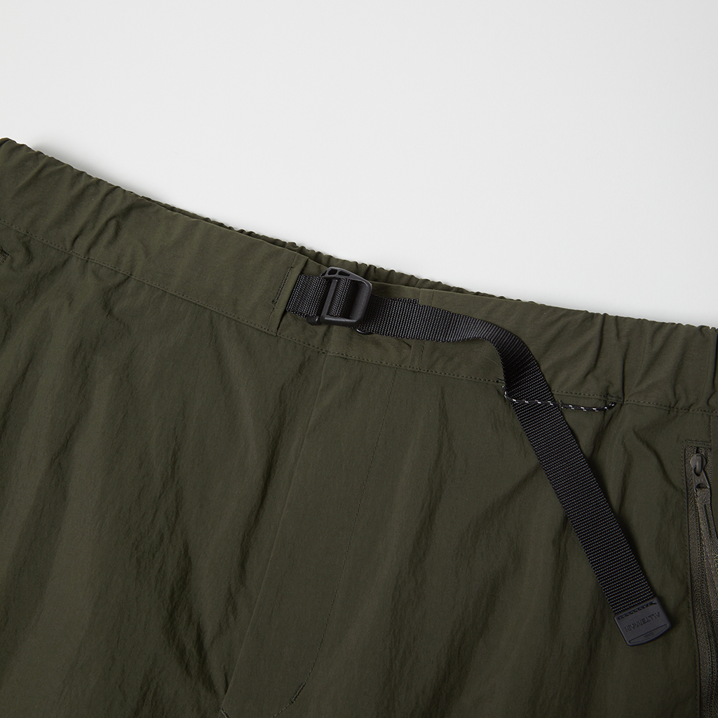 Wide cargo pants in Taslan nylon. Water repellency is achieved with a CO treatment, free from decomposition-resistant fluorine compounds. They offer excellent storage with zippered side pockets, snap-button back pockets with flaps and two large thigh pockets with dual compartments. The front closes with a button-and-zipper and a waist belt allows easy adjustment. The legs can be narrowed with rubber spindles and stoppers at the bottom hems. Suitable for a wide range of outdoor activities and everyday wear.