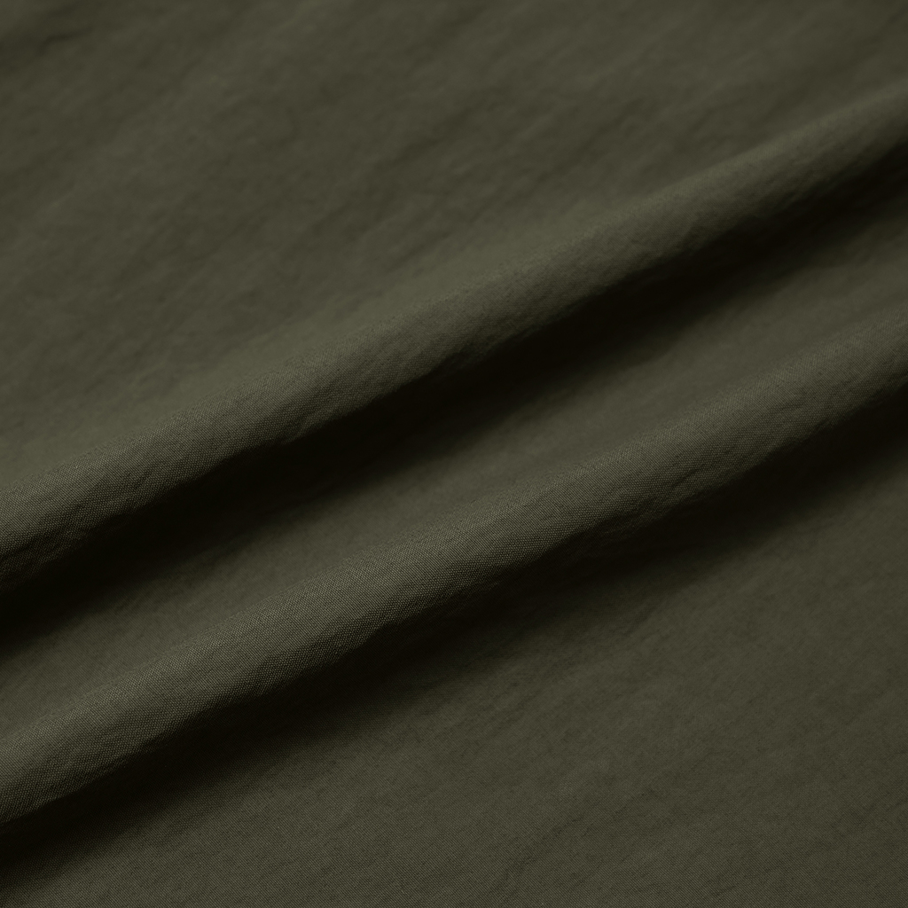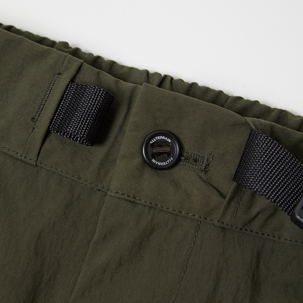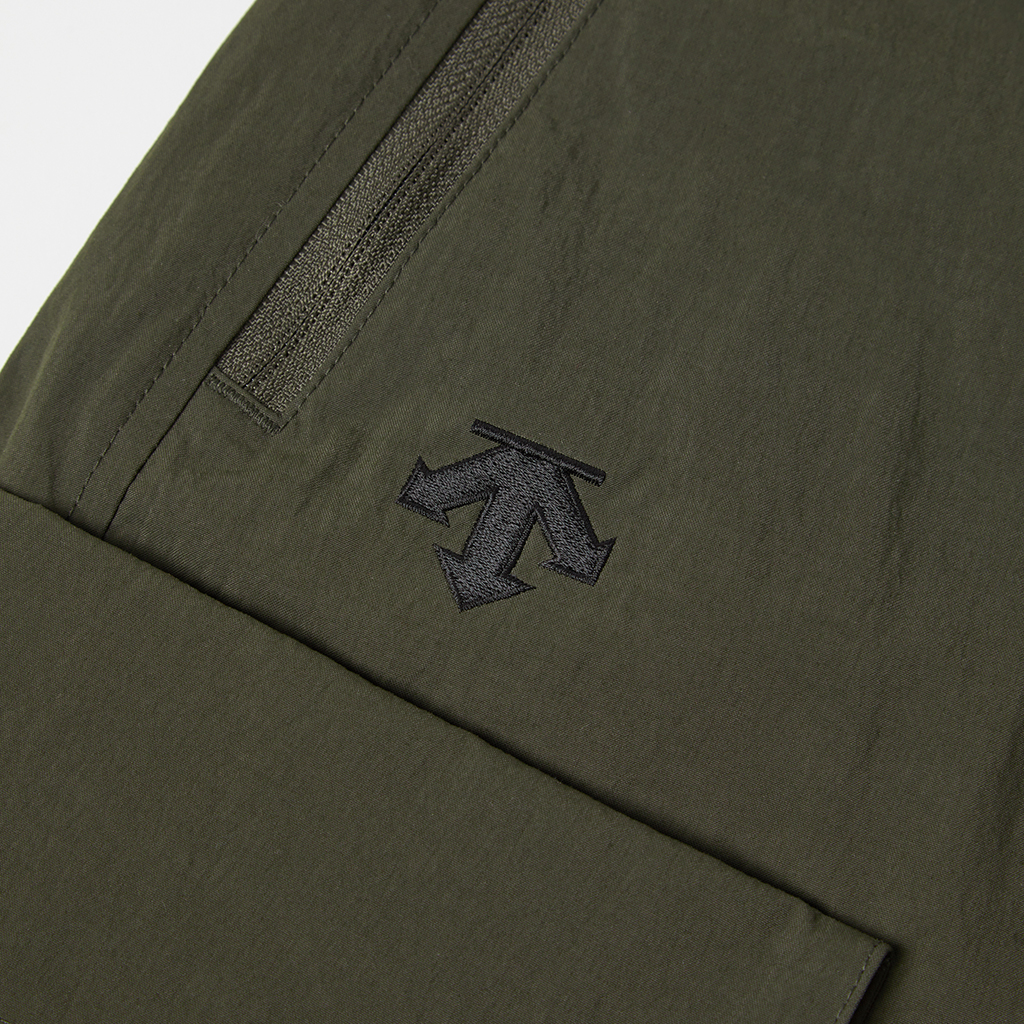 Wide cargo pants in Taslan nylon. Water repellency is achieved with a CO treatment, free from decomposition-resistant fluorine compounds. They offer excellent storage with zippered side pockets, snap-button back pockets with flaps and two large thigh pockets with dual compartments. The front closes with a button-and-zipper and a waist belt allows easy adjustment. The legs can be narrowed with rubber spindles and stoppers at the bottom hems. Suitable for a wide range of outdoor activities and everyday wear.