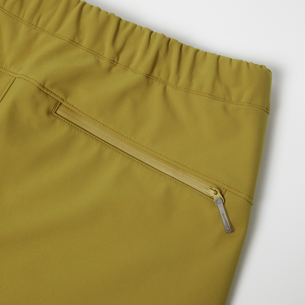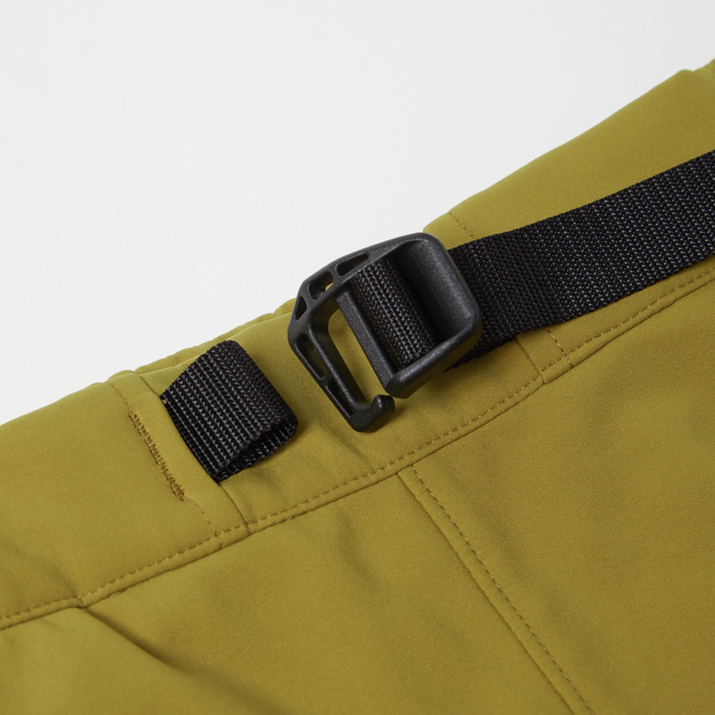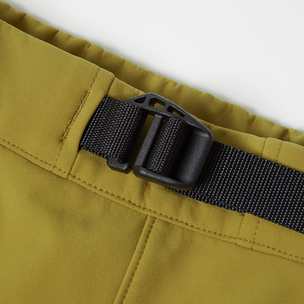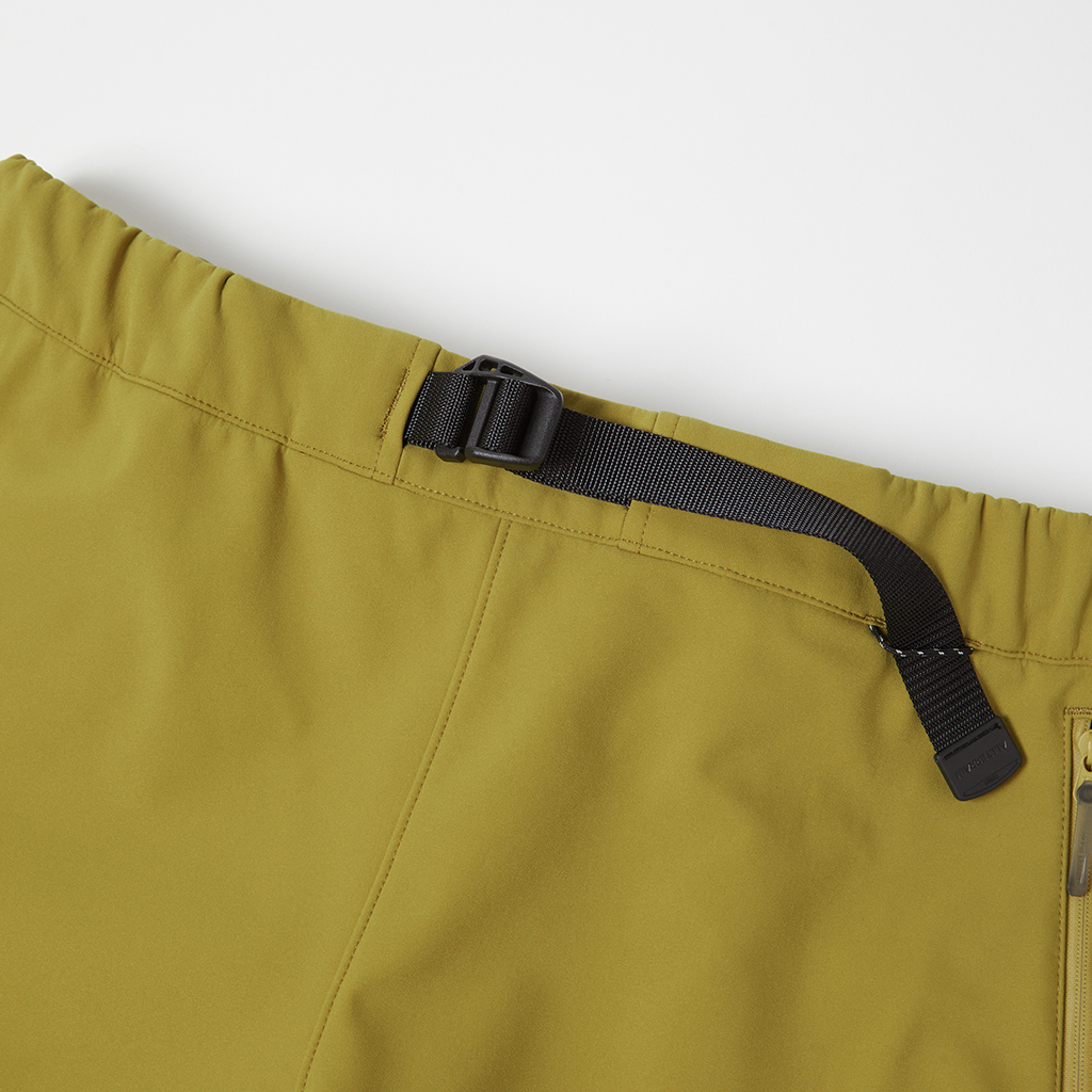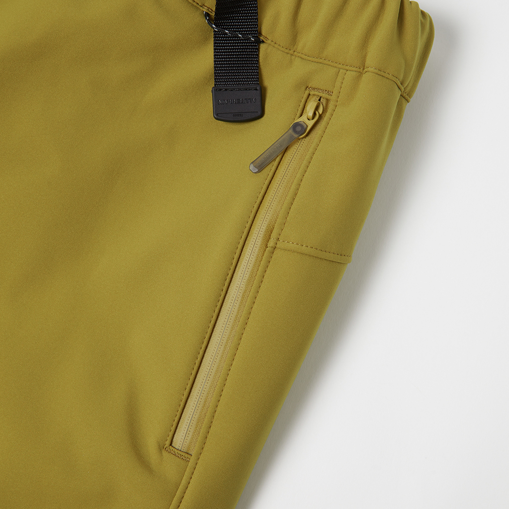Stretchy soft shell pants in a water repellent, water resistant, windproof 3L fabric. The C0 water-repellent coating does not use any environmentally damaging fluorine compounds. A grid structure on the inside improves comfort and adds stretch for freedom of movement. A waist belt allows easy adjustment and the legs can be narrowed with rubber spindles and stoppers at the bottom hems. To complement the water resistant fabric, the three pockets in the front and rear have waterproof zippers. Their functionality makes them ideal for outdoor activities as well as everyday wear.