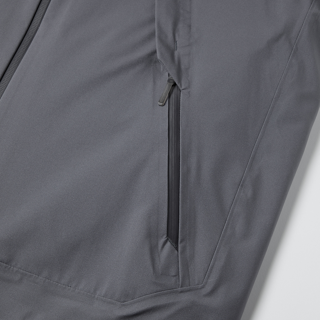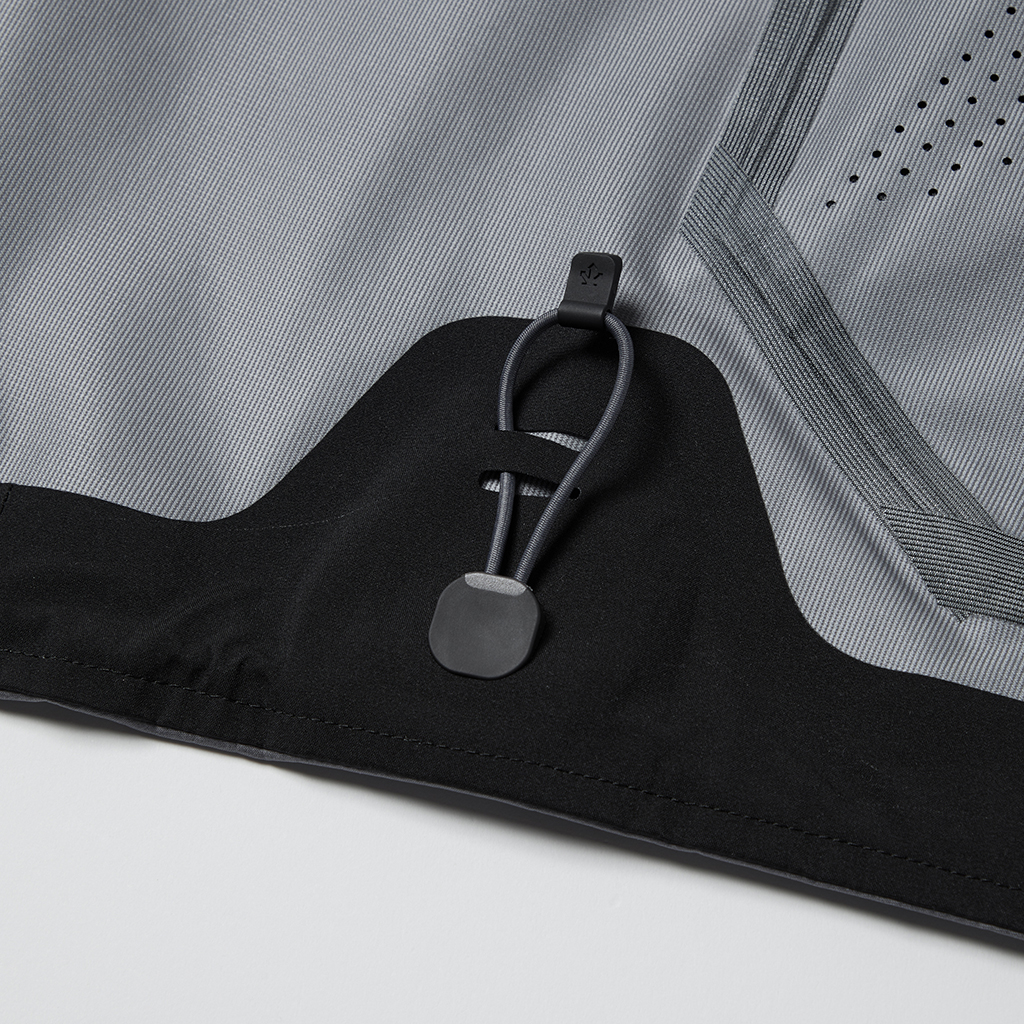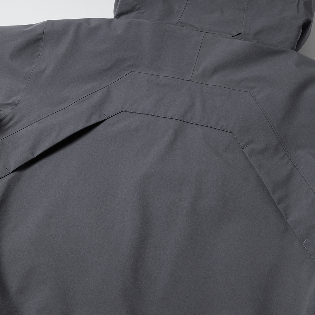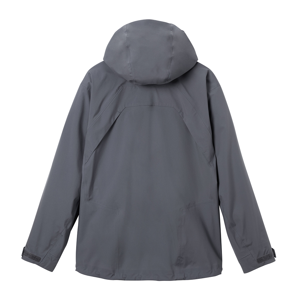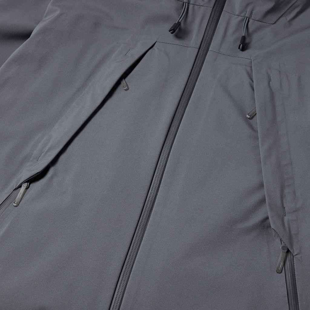 A 3-layer shell jacket in waterproof, breathable, windproof Dermizax. It features Descente’s proprietary dual-ventilation system with double zippers and double raschel fabric, to allow outside air in and to expel uncomfortable excess heat and moisture. There are four zippered pockets on the front left and right. Additional ventilation inside the garment is provided by double raschel fabric in some of the pocket pouches as well as strategically-placed ventilation and laser-cut holes. Mesh and laser-cut holes under the rear flap provide ventilation in the back of the jacket to prevent overheating. The hood has rubber spindles and stoppers for easy adjustment and the cuffs have a one-hand adjustment feature, allowing easy adjustment, even with gloves on. The hem is equipped with a Cohaesive? cord lock system, for quick and easy size adjustment. A soft, brushed tricot lining around the collar enhances comfort. The gusset pattern design from the underarms to the sleeves prevents the hem from riding up when arms are raised, offering greater comfort during physical activities. Suitable for all seasons in a wide range of environments, from outdoor activities to daily use.