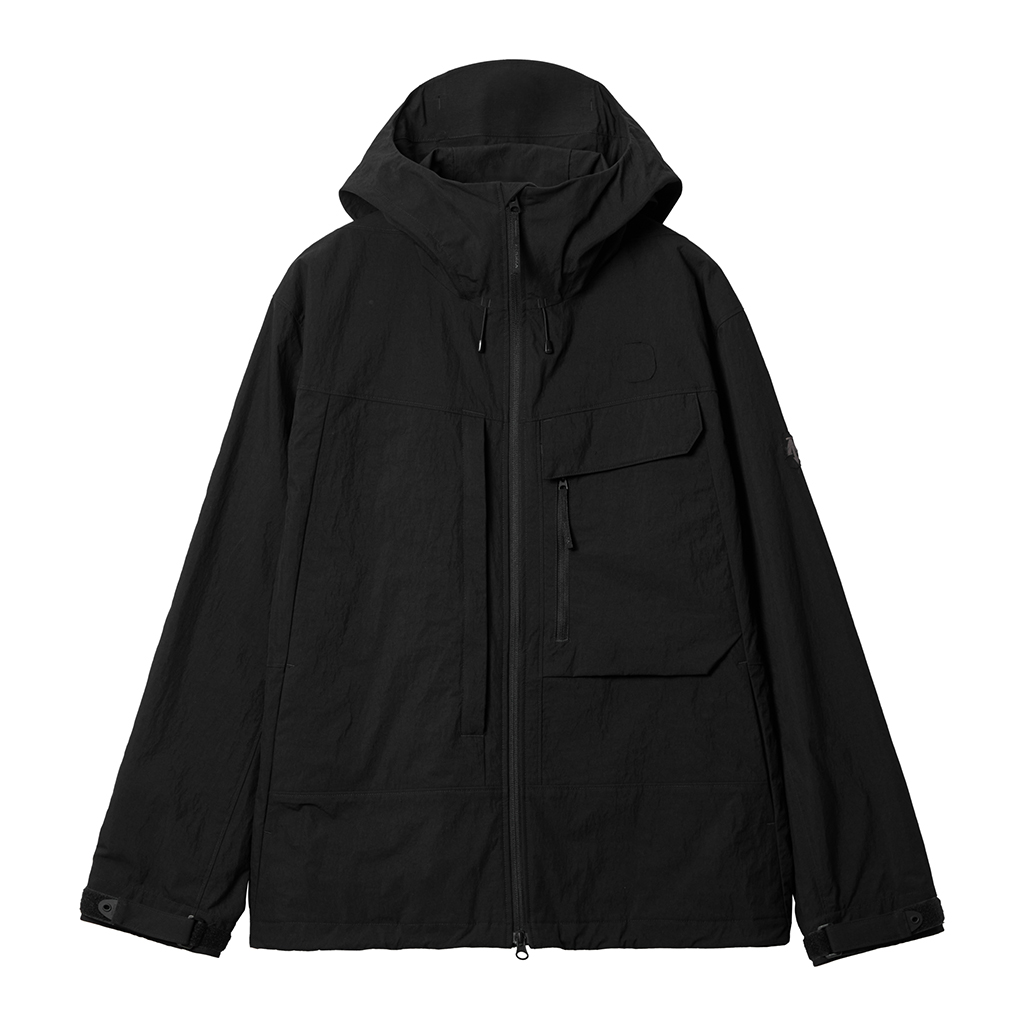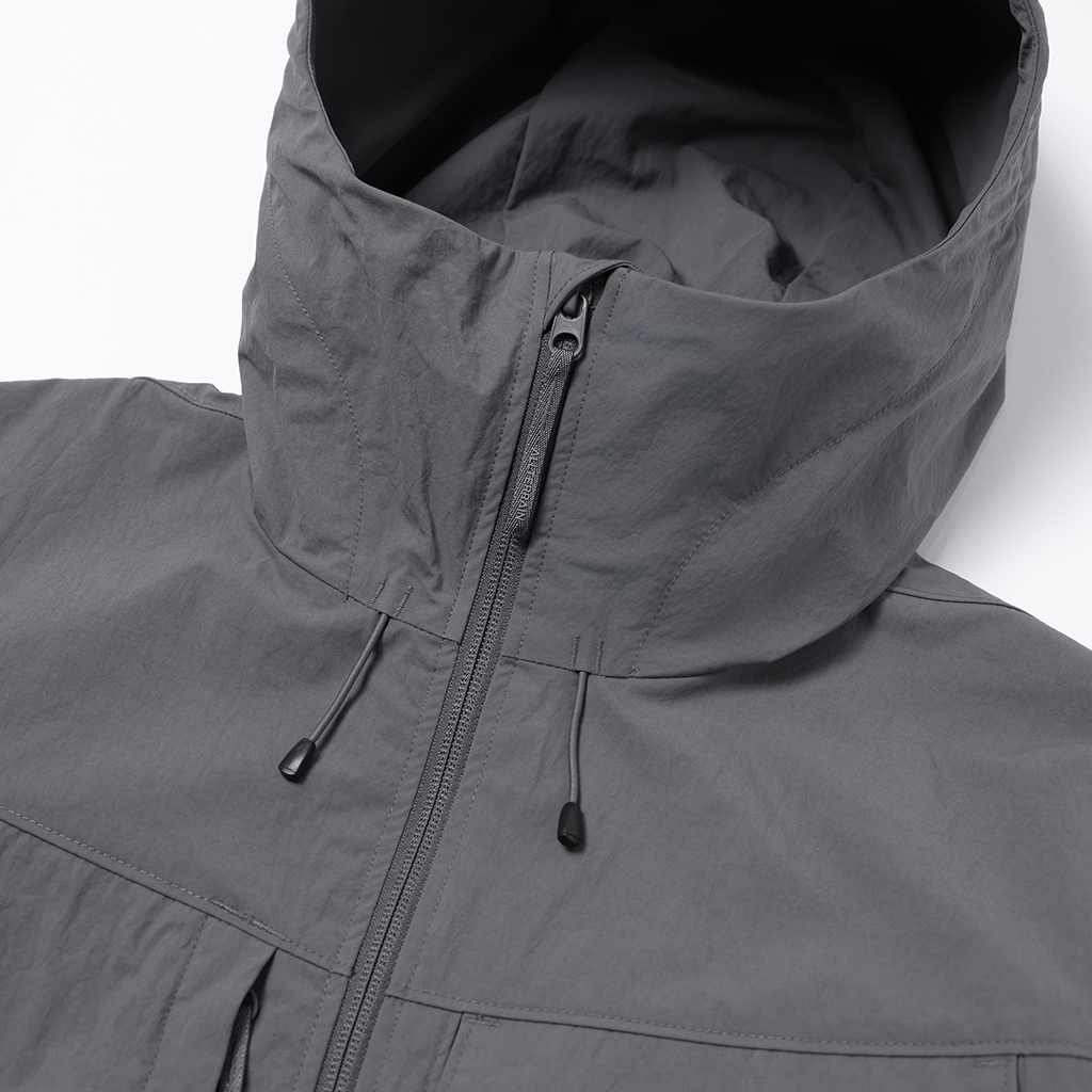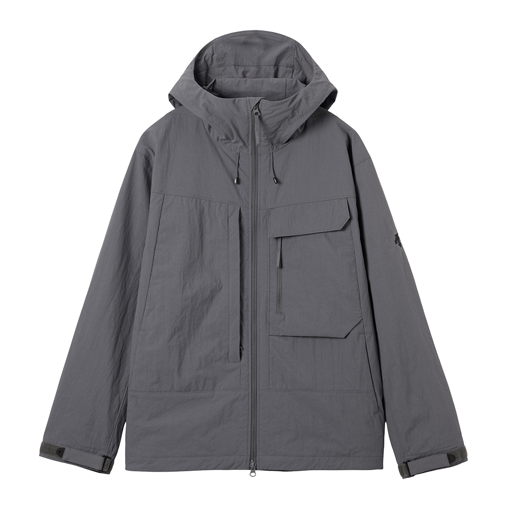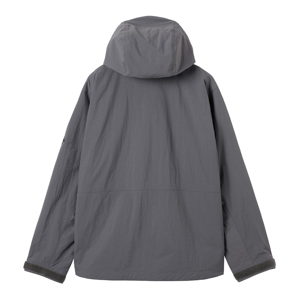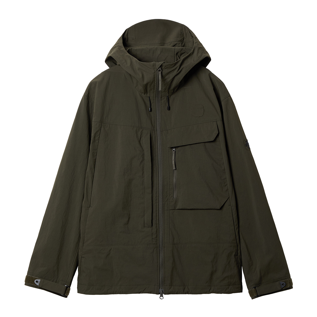 An insulated parka in Taslan nylon. Water repellency is achieved with a CO treatment, free from decomposition-resistant fluorine compounds. It features HEAT NAVI insulation in the lining for warmth and has five front pockets, of which the large zippered right one has internal compartments. The cuffs are adjustable with belt-style Velcro tape with easy to grip proprietary TAB CAPS. The hood and hem have rubber spindles and stoppers for easy adjustment. A soft, brushed tricot lining around the collar enhances comfort. With its slightly generous silhouette, this parka, with its large storage capacity, is versatile for both outdoor activities and everyday wear.