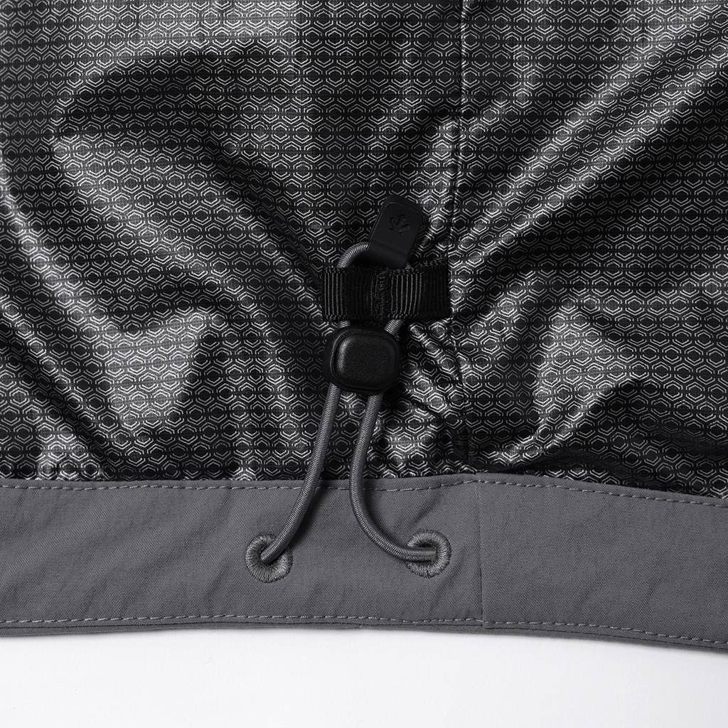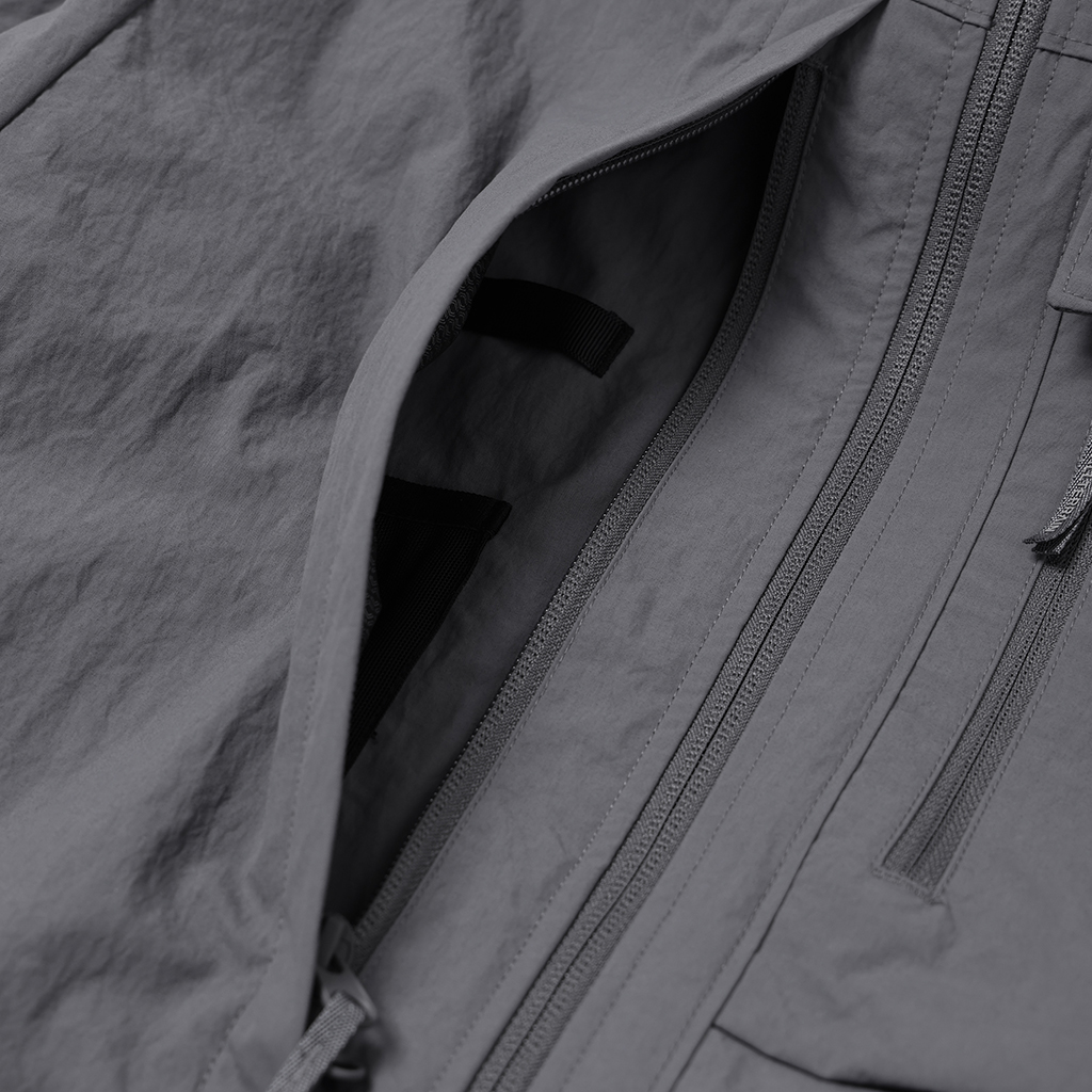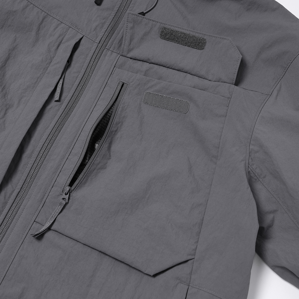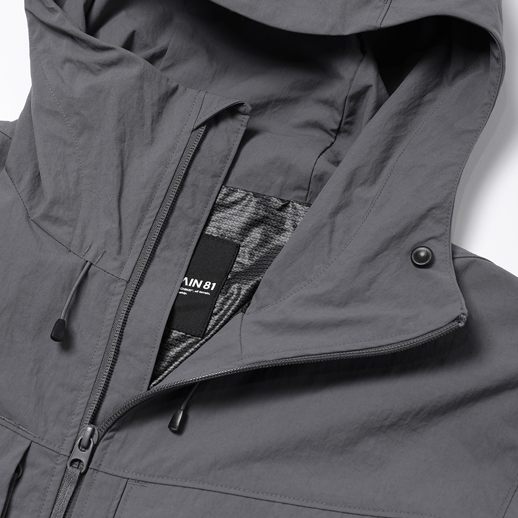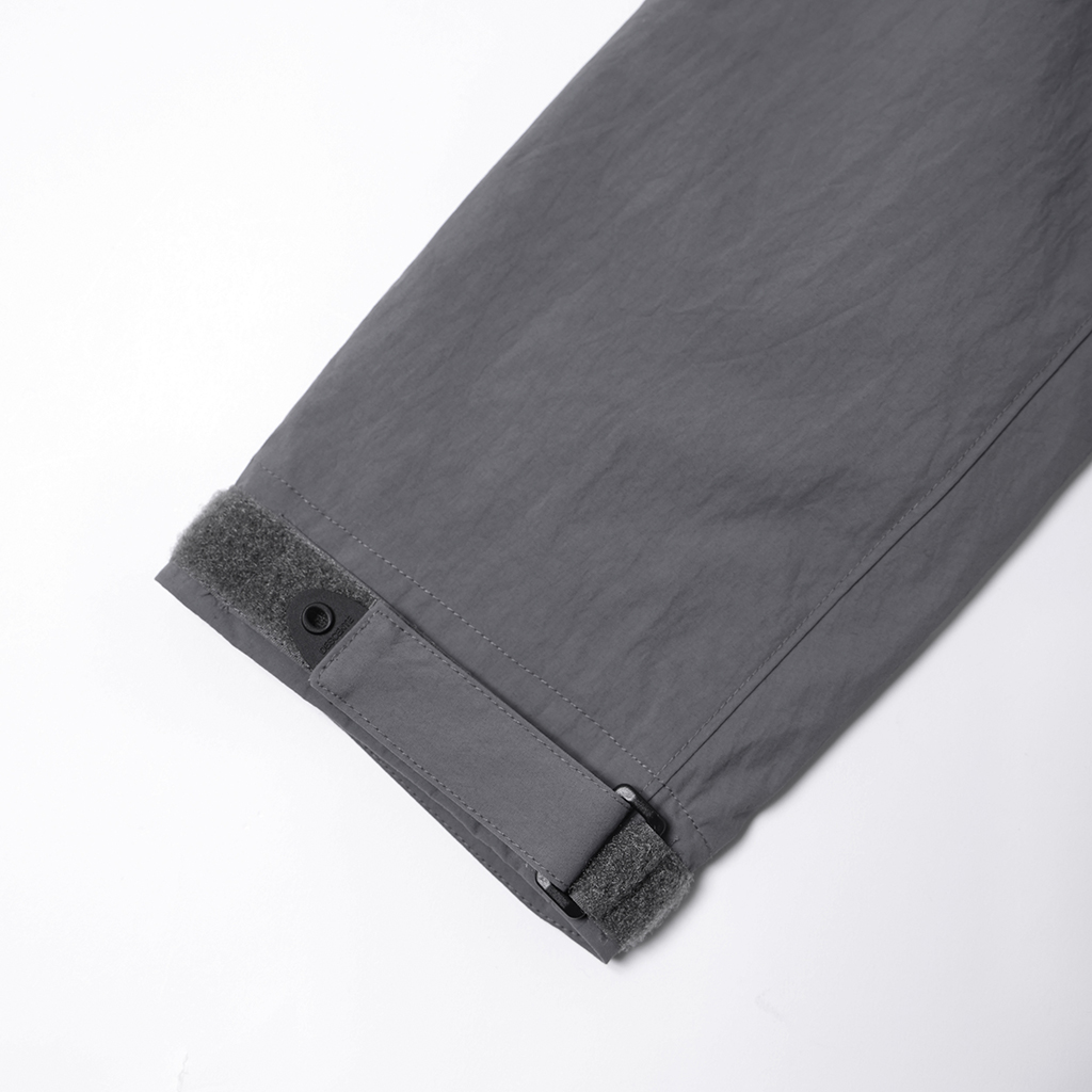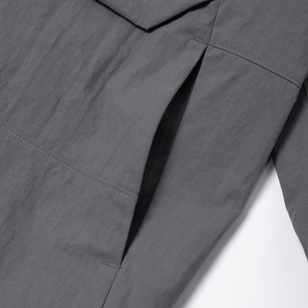 An insulated parka in Taslan nylon. Water repellency is achieved with a CO treatment, free from decomposition-resistant fluorine compounds. It features HEAT NAVI insulation in the lining for warmth and has five front pockets, of which the large zippered right one has internal compartments. The cuffs are adjustable with belt-style Velcro tape with easy to grip proprietary TAB CAPS. The hood and hem have rubber spindles and stoppers for easy adjustment. A soft, brushed tricot lining around the collar enhances comfort. With its slightly generous silhouette, this parka, with its large storage capacity, is versatile for both outdoor activities and everyday wear.