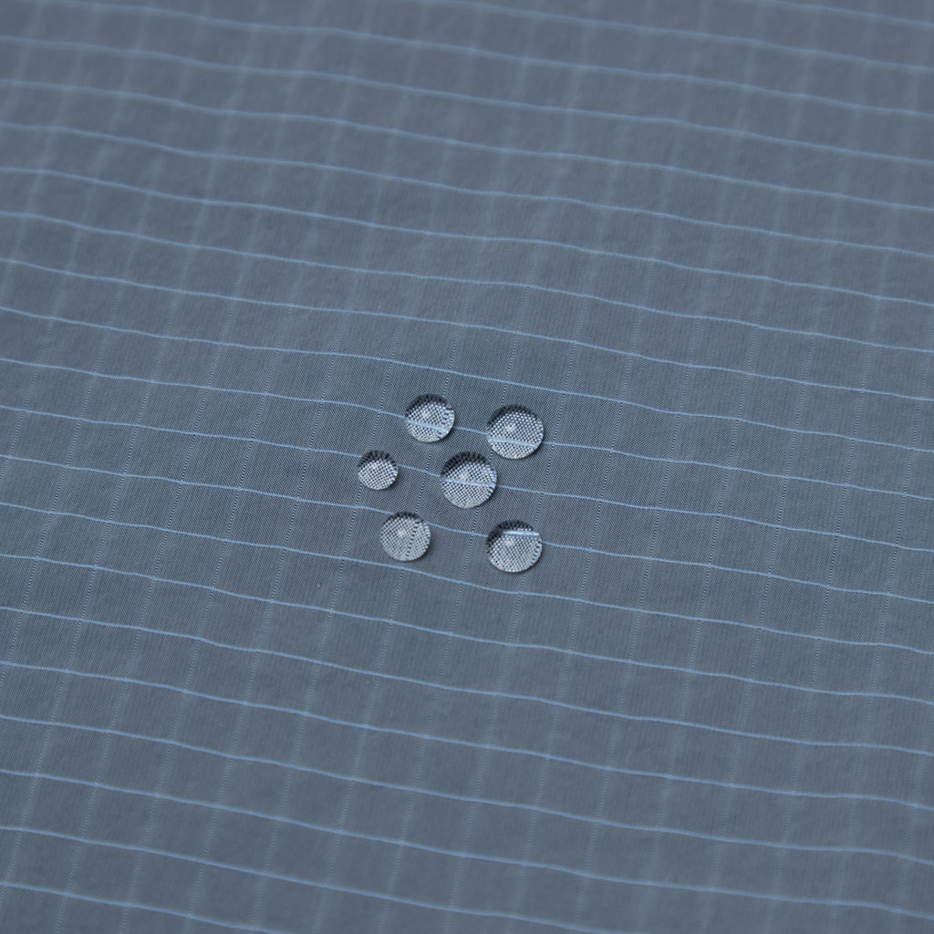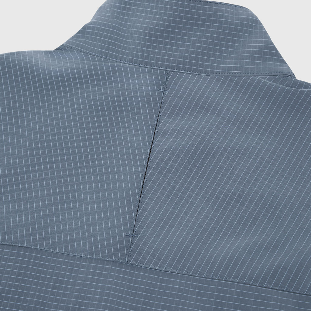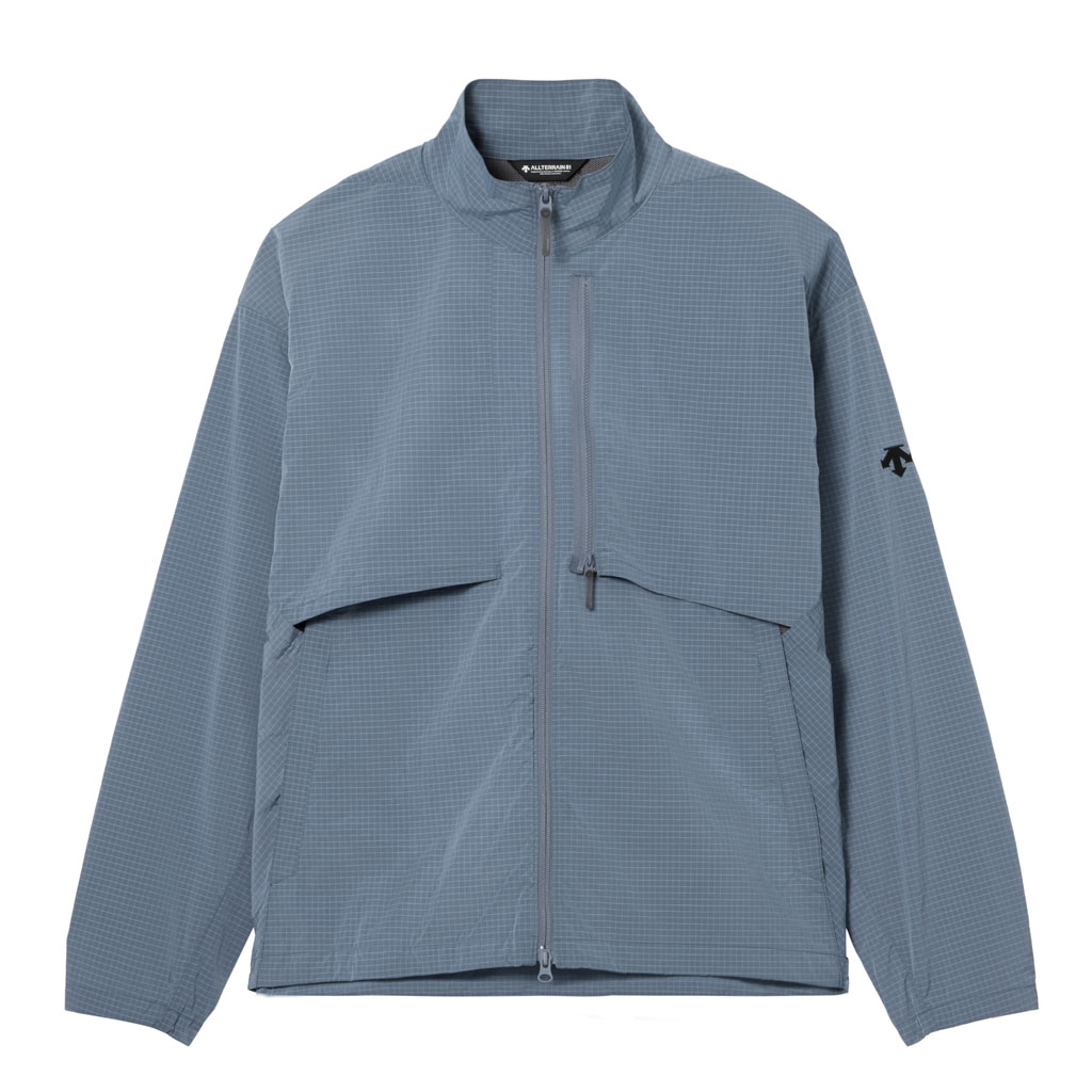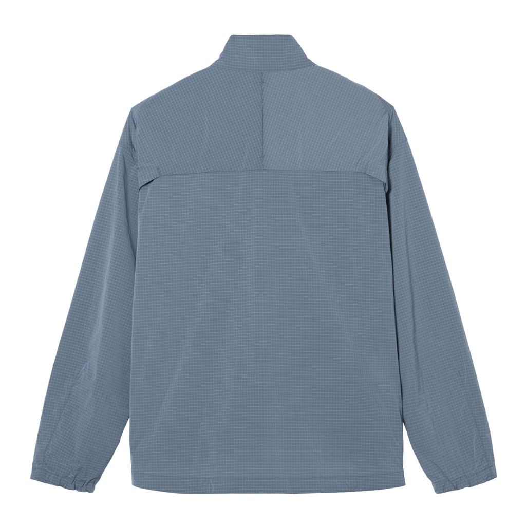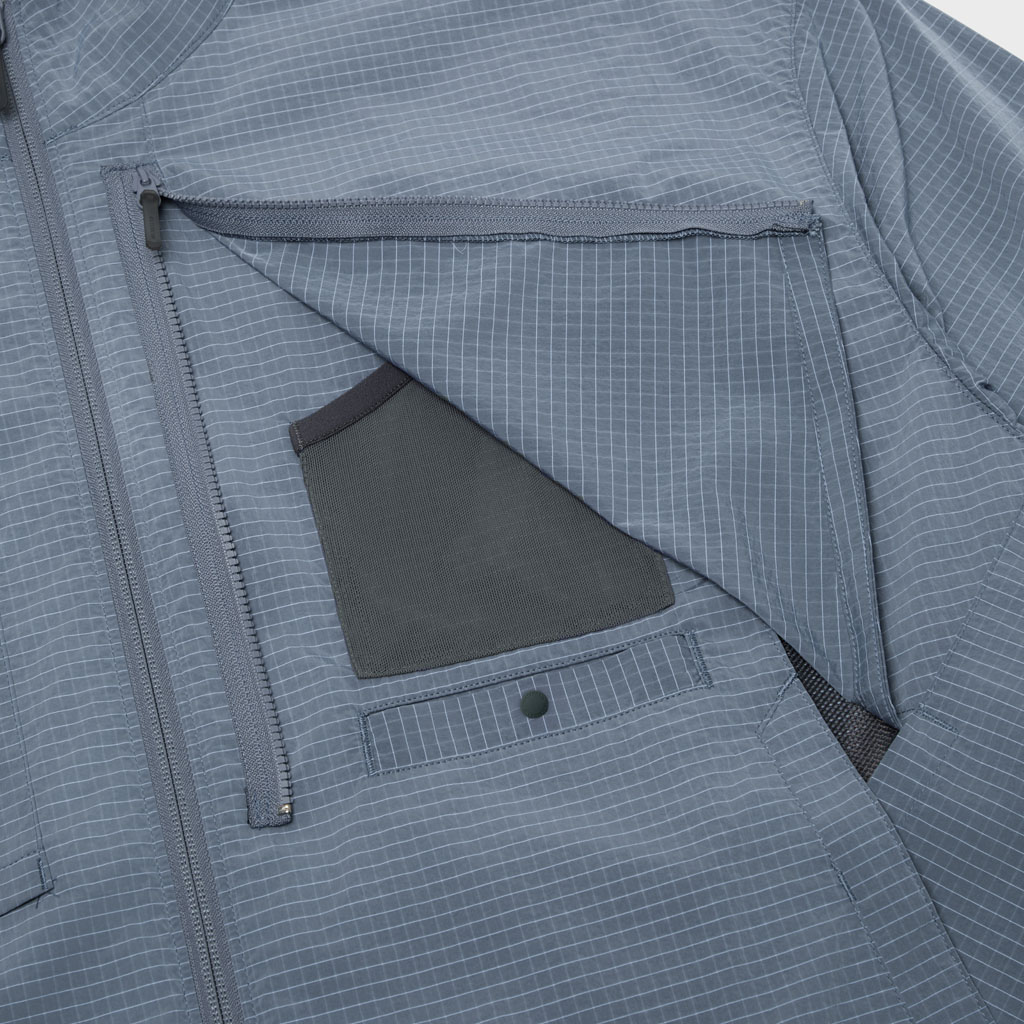 A fullzip jacket in a distinctive ripstop fabric that changes appearance with light and angles. Alternating thick and thin warp yarns (40D filament and 160D Taslan) are used to create surface texture, while weft yarns resist dyeing and reflect light for a rich, multidimensional look. The front has a seamless, origamiinspired three piece VZ (ventilation) structure, blending aesthetics and airflow. The left chest pocket opens from the bottom to reveal a mesh patch pocket and a welt pocket with a key hook ? fusing utility with modern design to bring a new rhythm to everyday movements. This parka brings out the uniqueness of the fabric, showcasing its appeal through both appearance and functionality.
