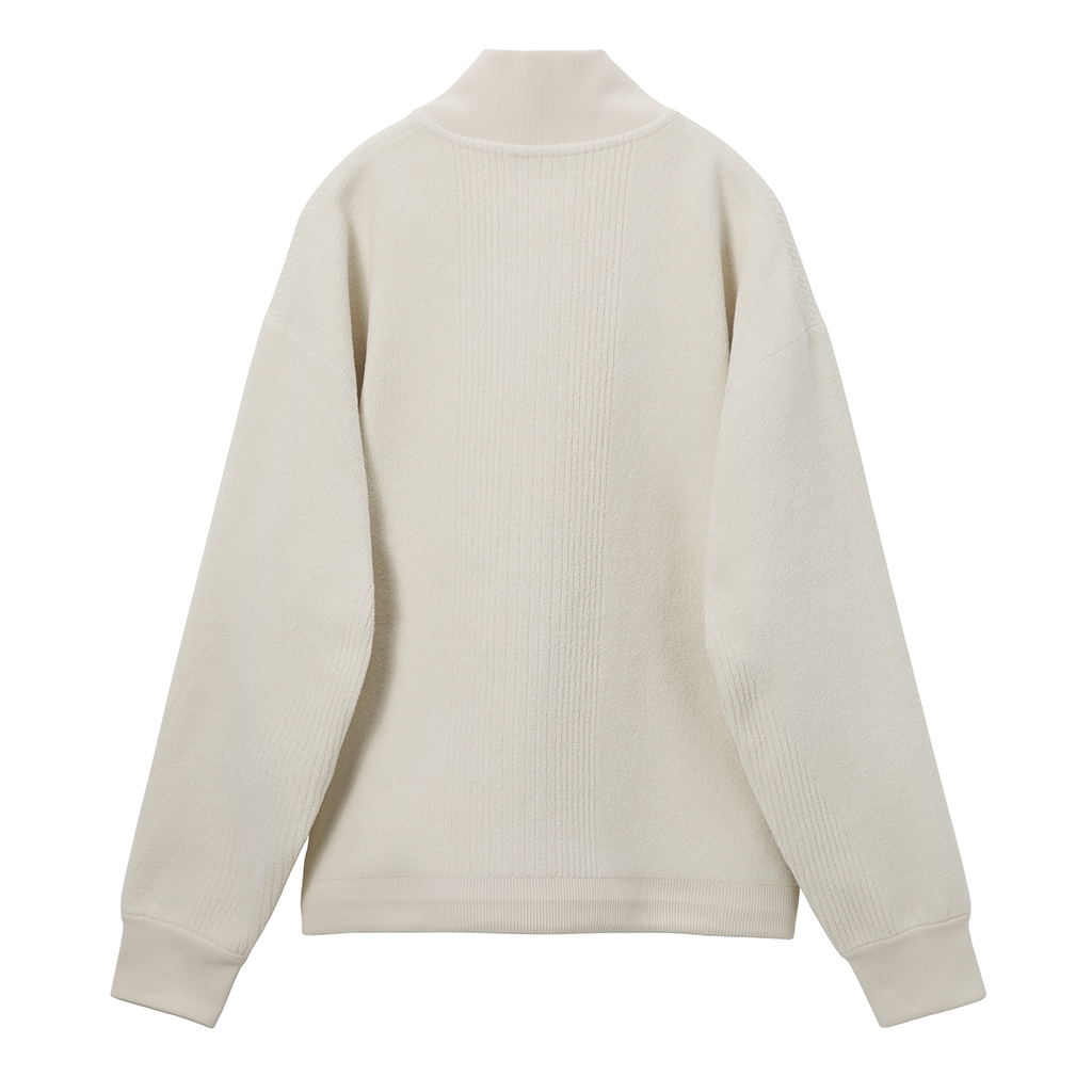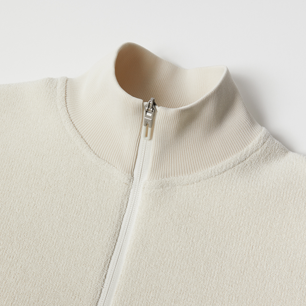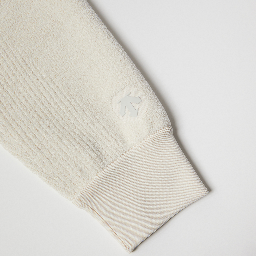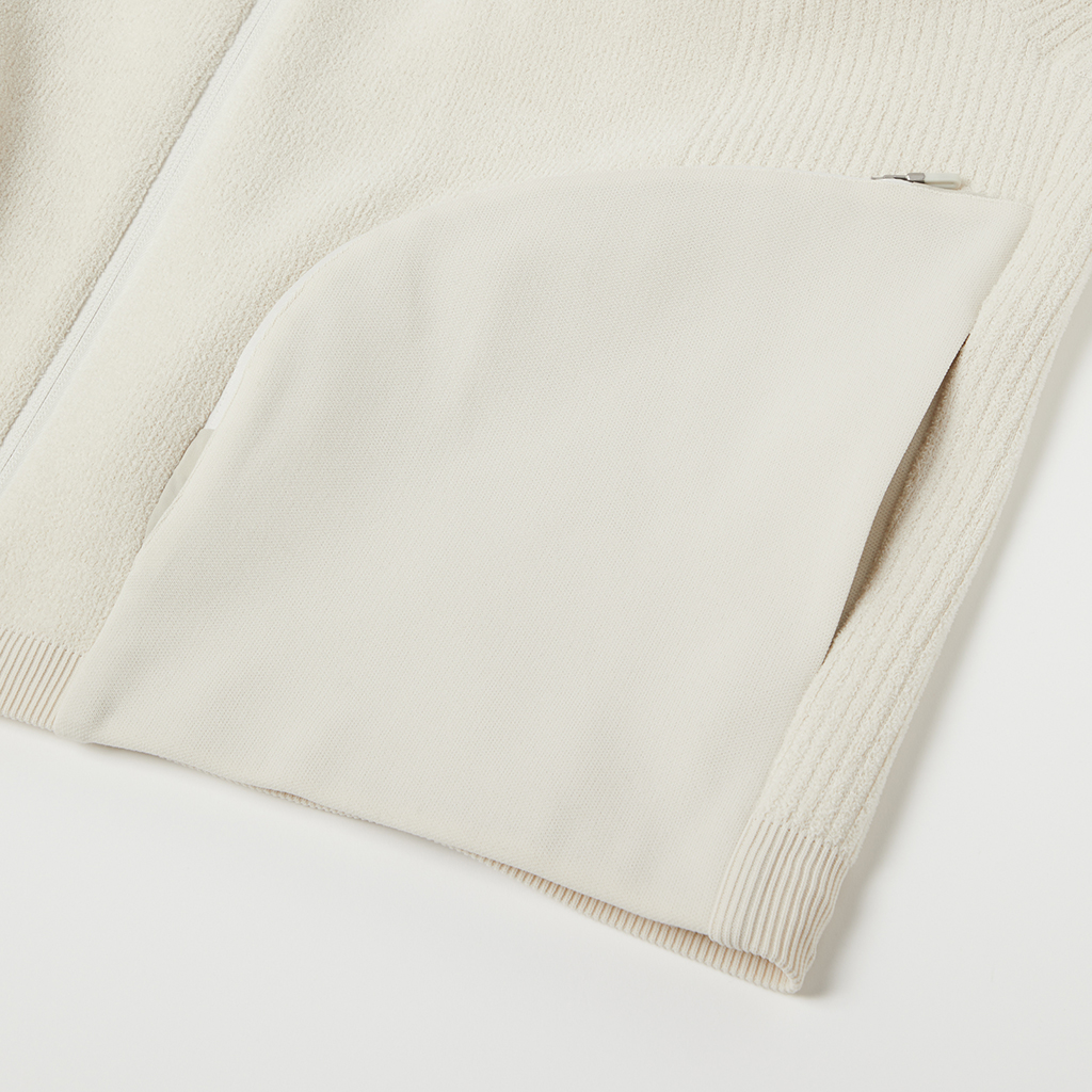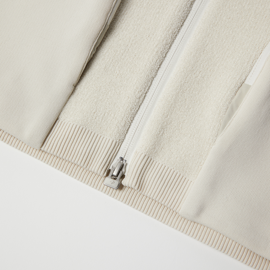 A stripe pattern MA1 bomber jacket in the FUSIONKNIT series. Different jacquard patterns are knitted into a single fabric piece for the body and sleeves for effective breathability and stretch with minimal seaming. Descente's unique pattern-making ensures a 3D silhouette and airy comfort. The textured inner knit minimizes skin contact. This MA1 bomber jacket combines freedom of movement and comfort in a seamless design using knit and sew manufacturing with ultrasonic welding and heat bonding.