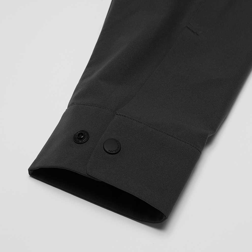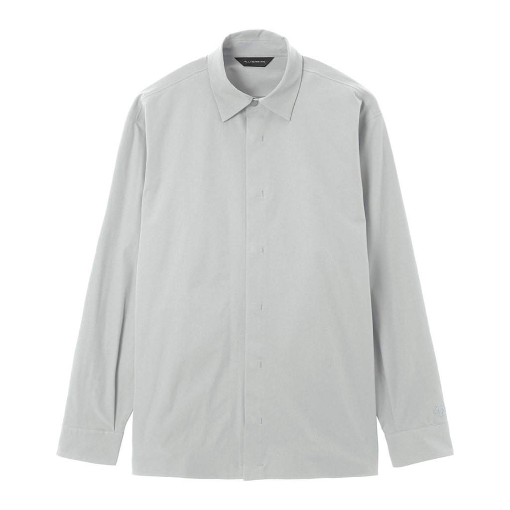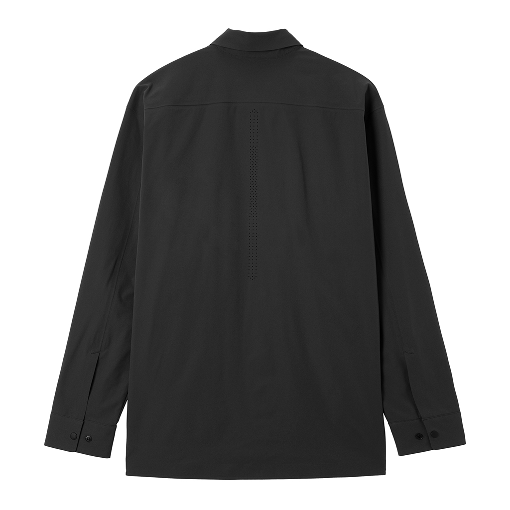 A soft long sleeve T-shirt with excellent stretch and water repellency. The relaxed silhouette creates an airy, comfortable fit. Ultrasonic welding and heat bonding create a seamless interior and ensure the stretch is unimpeded. Its minimalist aesthetic offers styling options for both business and casual settings.