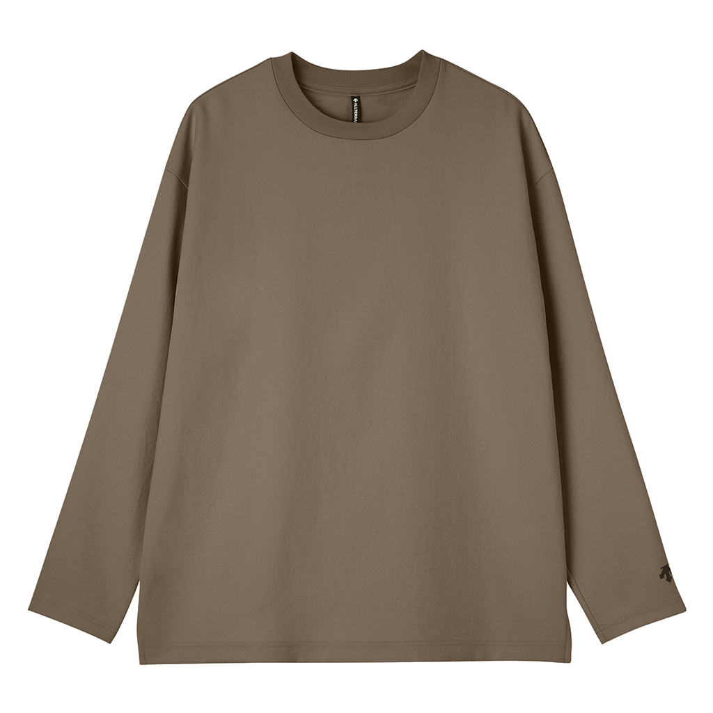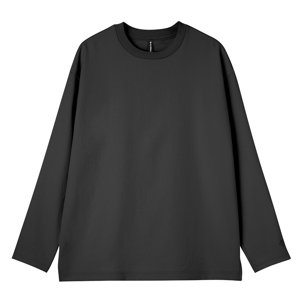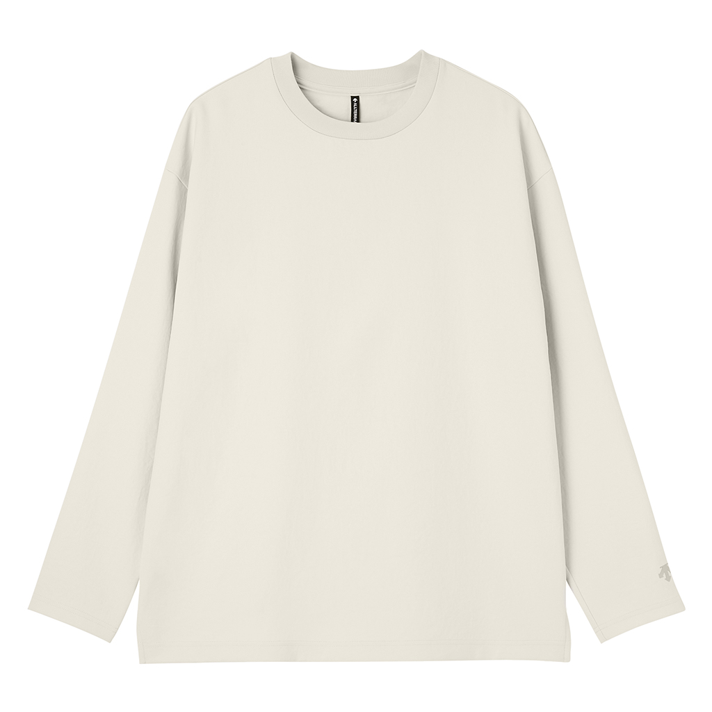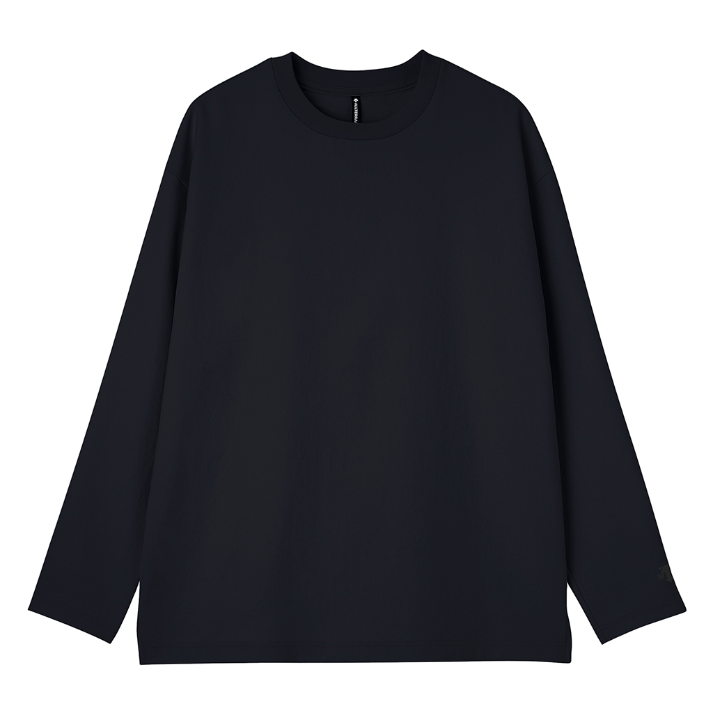 A long-sleeve T-shirt in a UV-blocking, stretch fabric. The fabric is with an easy texture and stretch and a slightly relaxed silhouette. In an antibacterial yarn it is easy to care for with home laundering. Despite its soft, sweatshirt-like comfort, it has a sophisticated appearance suitable for both business and casual settings. Ideal for wearing alone or layering under a tailored jacket.lightweight and thin but the use of matte full dull yarn prevents transparency. With excellent moisture absorption, it is comfortable for most of the year and is fine for both business and casual wear.