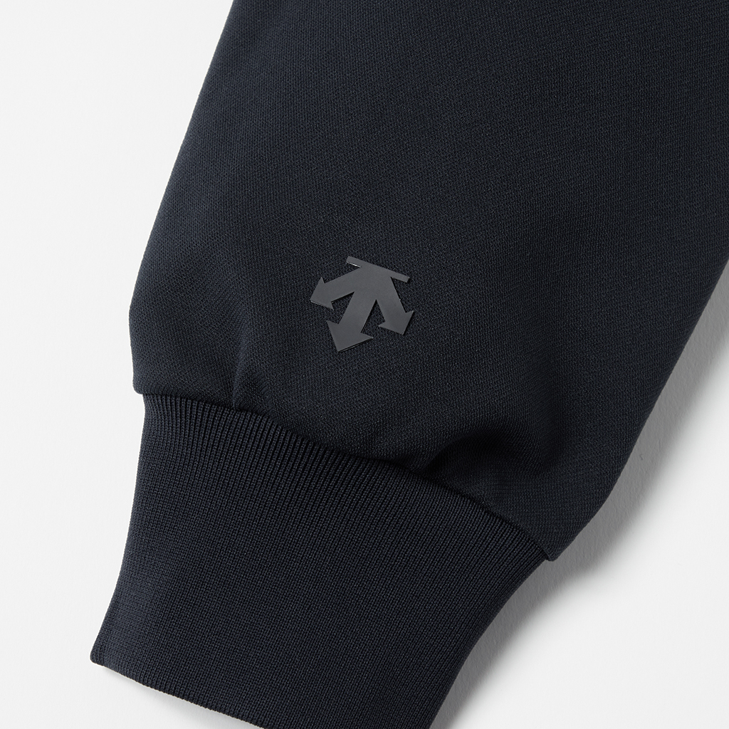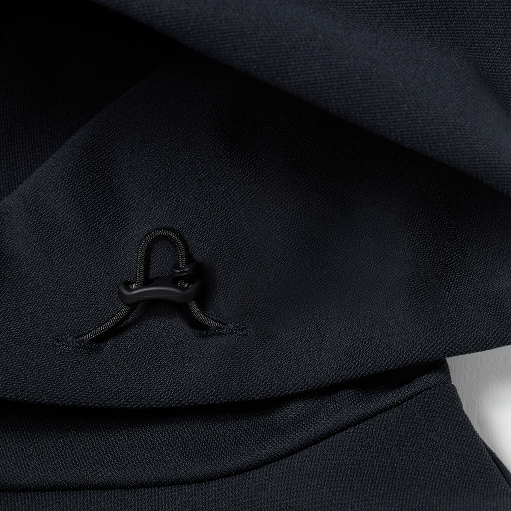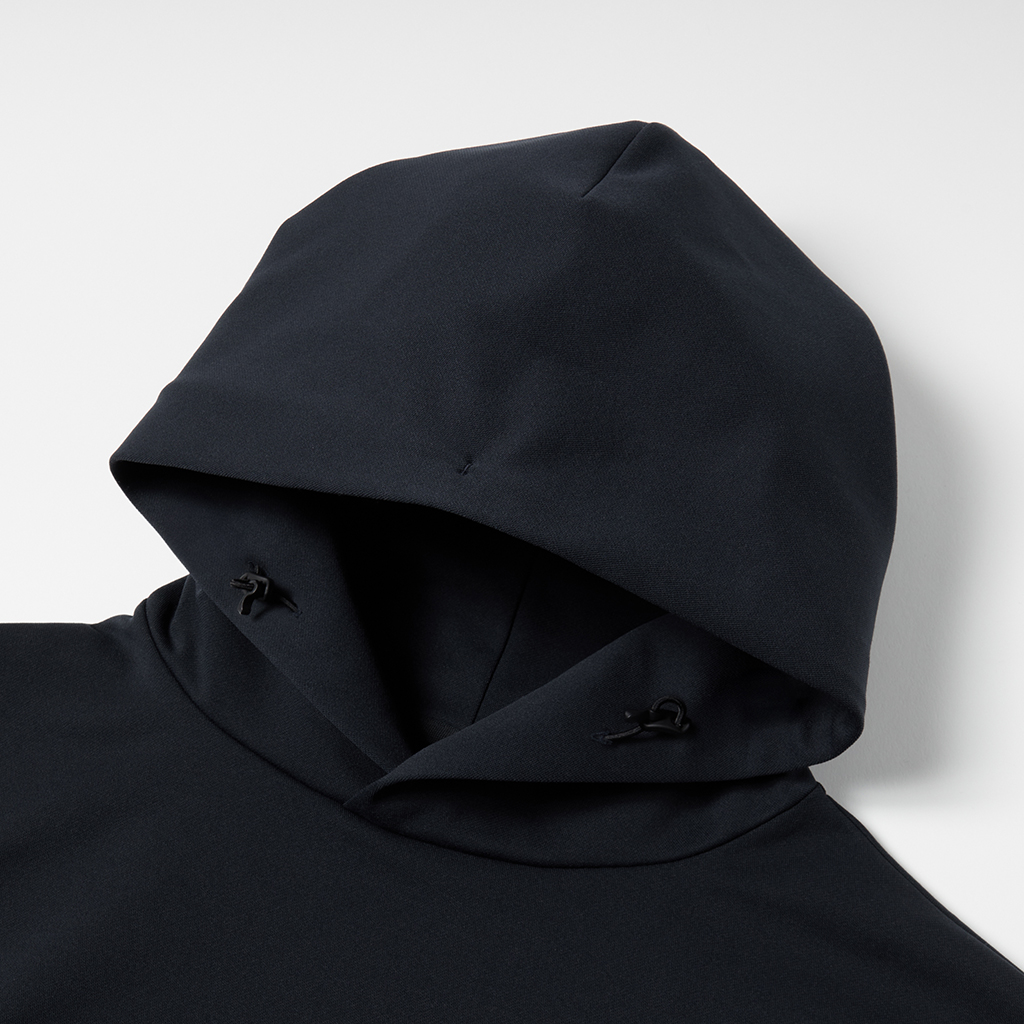 A hoodie in a moderately thick, moisture-wicking, quick-drying fabric. This season the sizing has been adjusted so it can be worn as an inner layer, designed so the sleeves do not pull up when worn under a jacket. Interfacing around the edge of the hood ensures it retains its shape when not in use. It can be worn under a jacket or with a track jacket for more casual occasions.