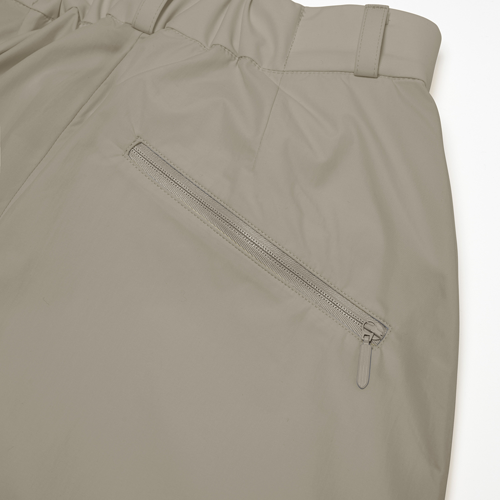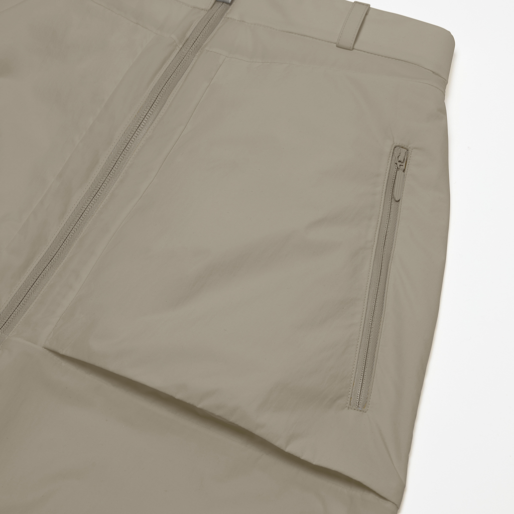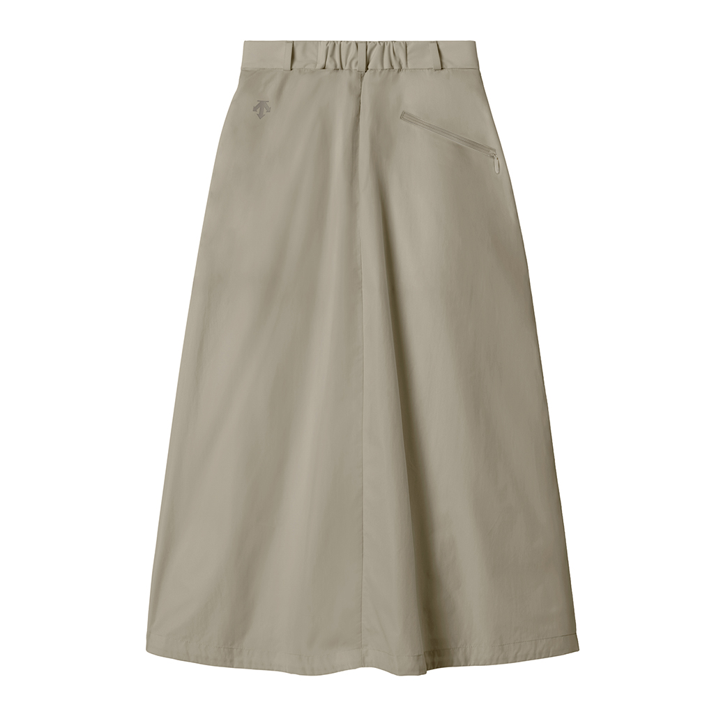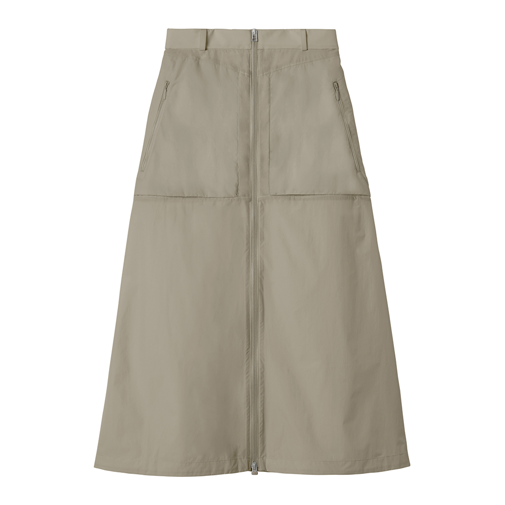 A long skirt with a soft texture and excellent stretch, combined with water-repellency. The zipper at the hem creates a slit-like effect, adding a sense of flow to the design.