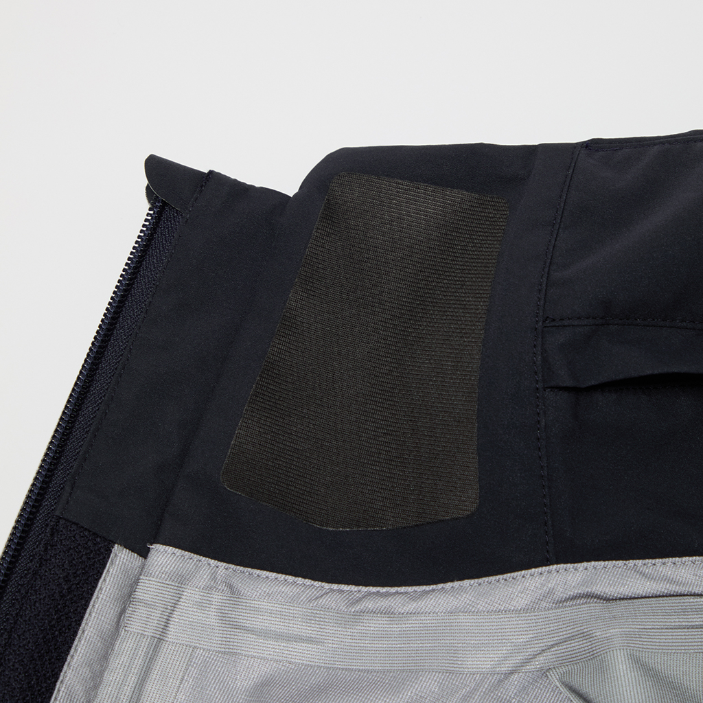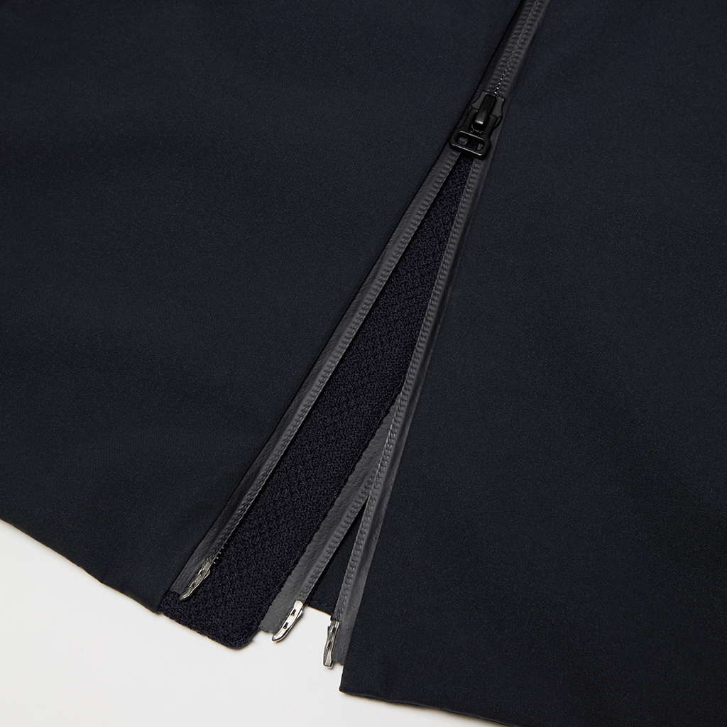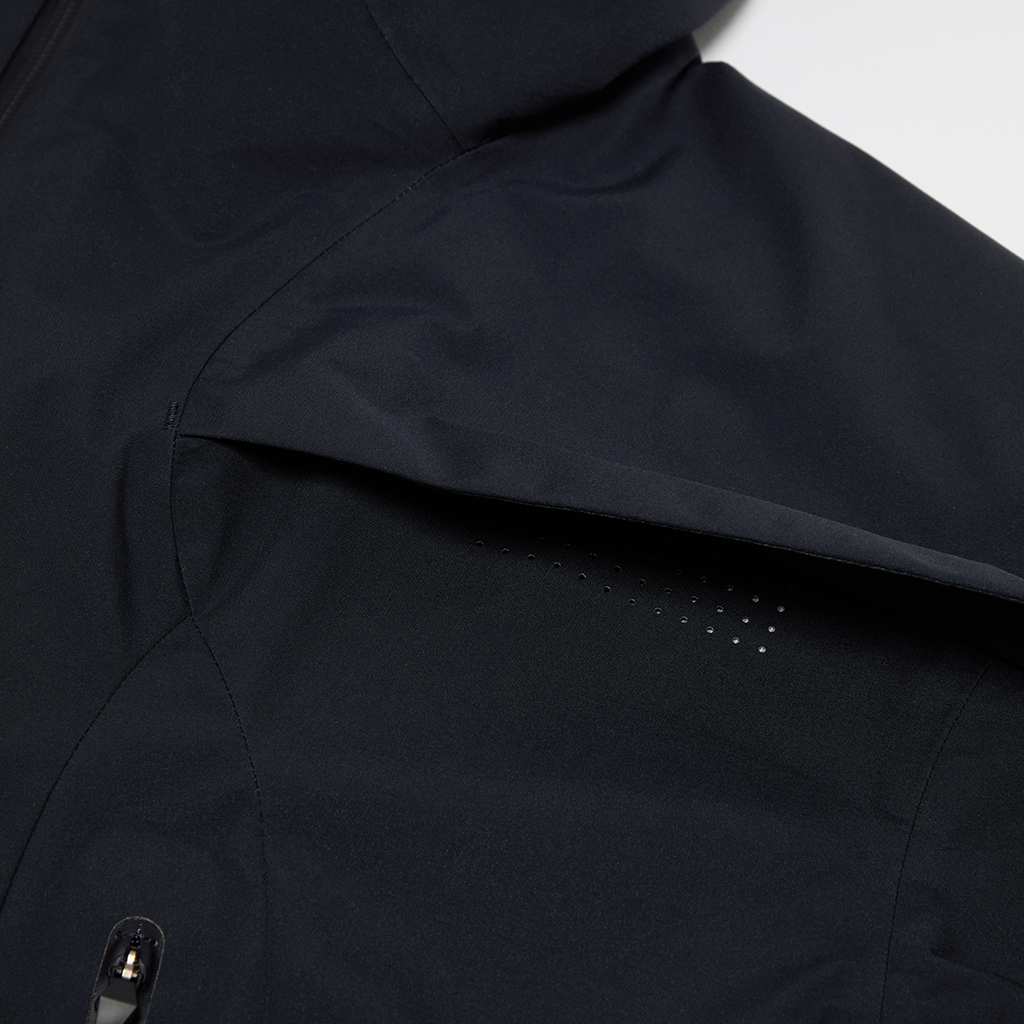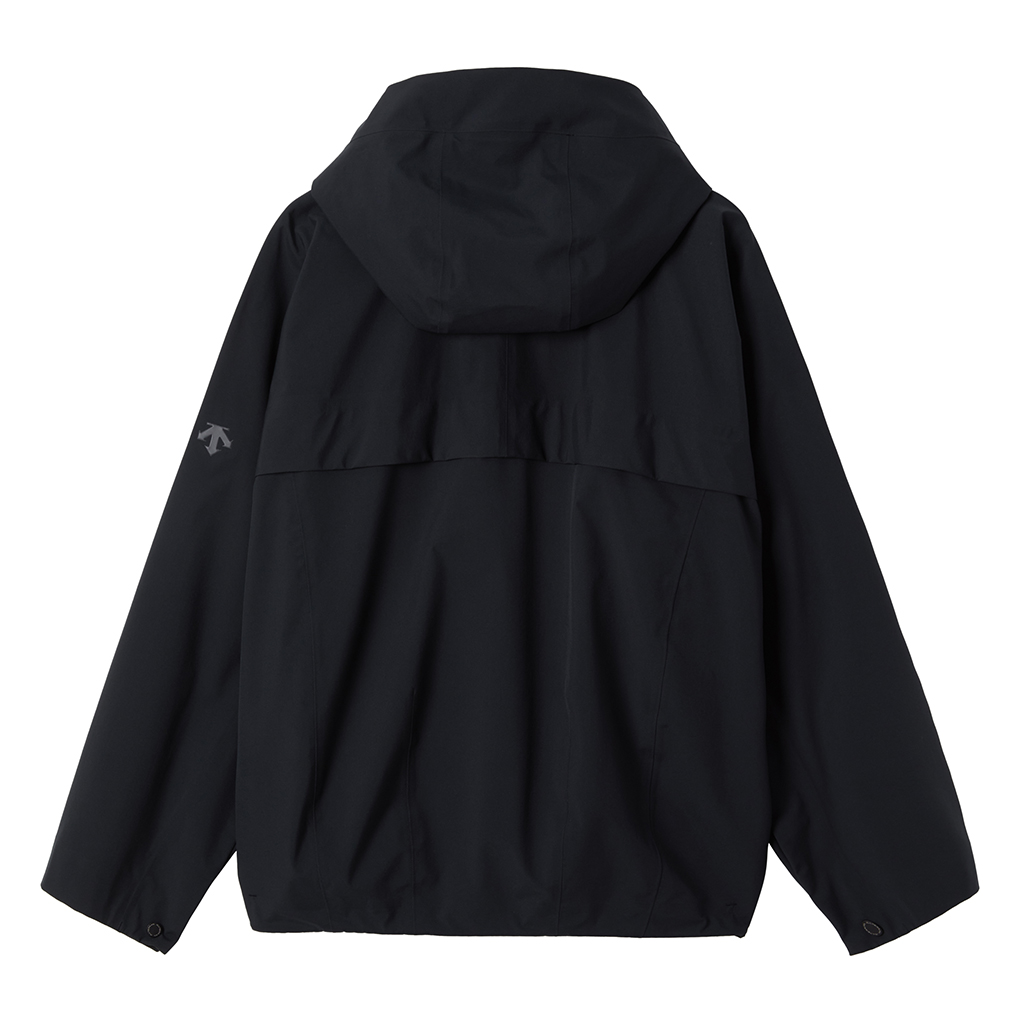 A hard shell jacket in DERMIZAX WINDTIGHT NYLON 3L offering an excellent balance between waterproofing and breathability. The silhouette is unique, designed to maximize ventilation and made with structured flaps from chest to sleeve cuffs. Air can be drawn in through the flaps and released through the back of the jacket. The front Dual-Zip Ventilation System, developed by Descente, allows fresh outside air to enter the jacket through a mesh panel between the zippers, and also expels uncomfortable heat and humidity.The short front and voluminous body and sleeves create a rounded 3D silhouette allowing air to move easily inside the garment. The hood has a Parahood System to prevent water pooling in bad weather. Snap buttons on the cuffs offer both fit and styling options.