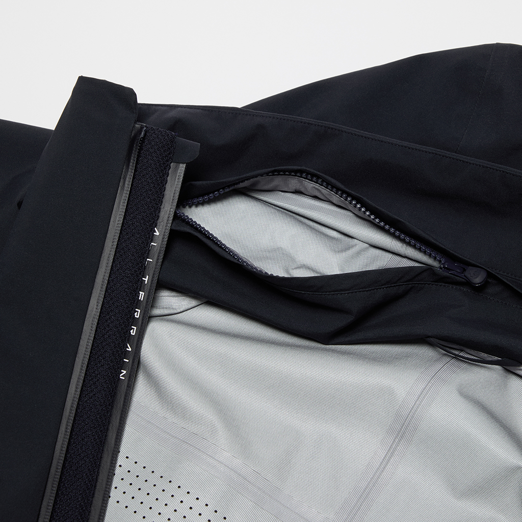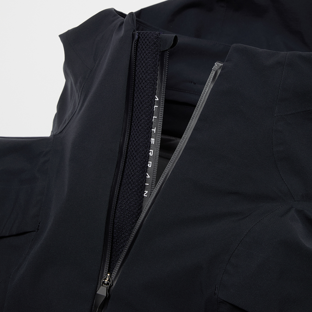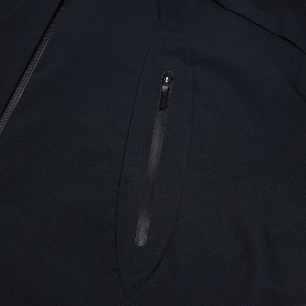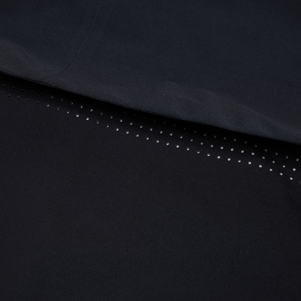 A hard shell jacket in DERMIZAX WINDTIGHT NYLON 3L offering an excellent balance between waterproofing and breathability. The silhouette is unique, designed to maximize ventilation and made with structured flaps from chest to sleeve cuffs. Air can be drawn in through the flaps and released through the back of the jacket. The front Dual-Zip Ventilation System, developed by Descente, allows fresh outside air to enter the jacket through a mesh panel between the zippers, and also expels uncomfortable heat and humidity.The short front and voluminous body and sleeves create a rounded 3D silhouette allowing air to move easily inside the garment. The hood has a Parahood System to prevent water pooling in bad weather. Snap buttons on the cuffs offer both fit and styling options.