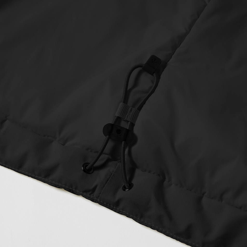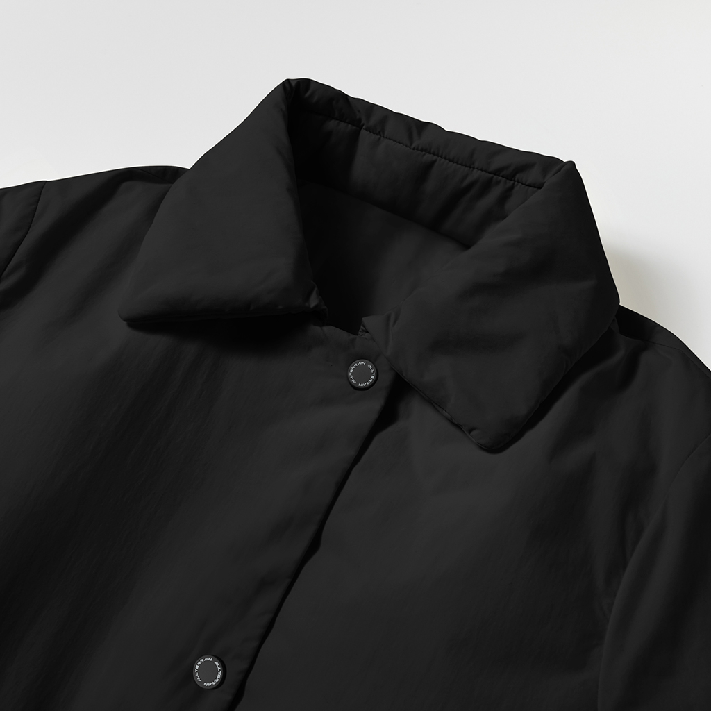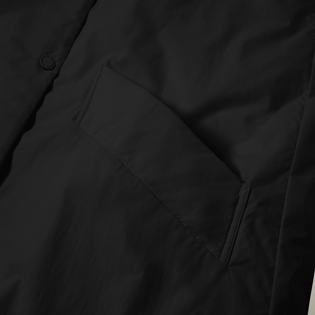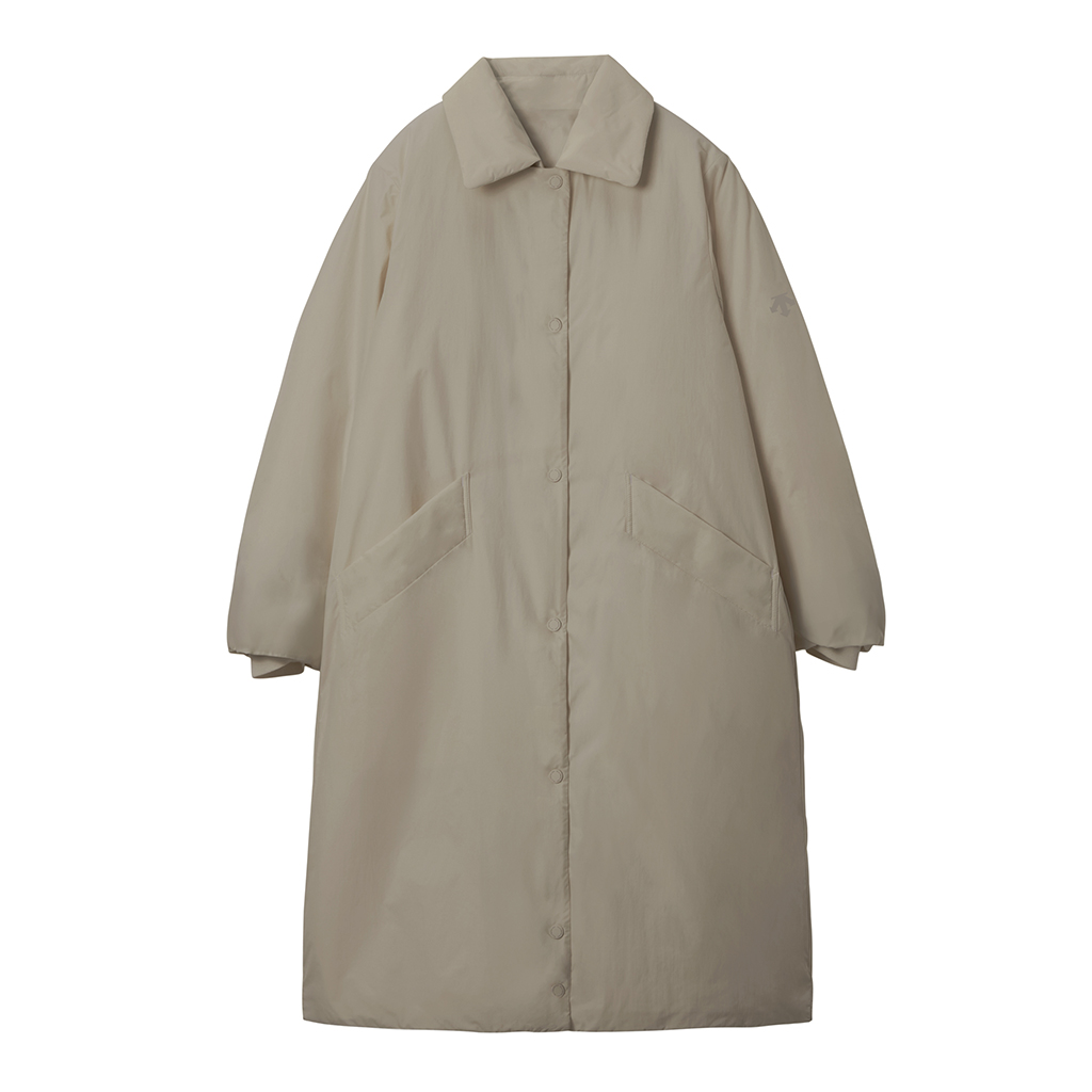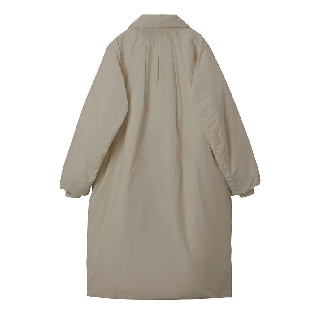 A lightweight, water repellent coat insulated with HEAT NAVI?. The generous cut through the chest and armholes allows for adding layering pieces of varying thickness underneath. Styling options are possible such as changing the silhouette with a drawstring at the hem. A simple and elegant silhouette finished with a center back tuck.