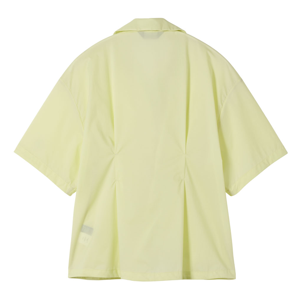 A half-sleeve skipper collar shirt in a sheer fabric with water repellency and breathability. Tucks at the front and back of the waist give a structured look and promote internal airflow. Laser-cut underarm perforations support ventilation and the skipper collar enhances comfort awith a polished, feminine look.