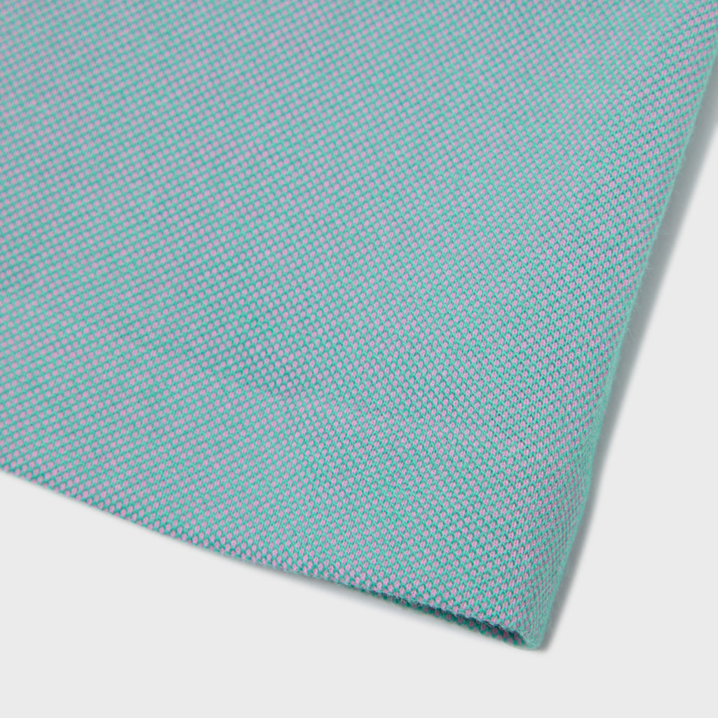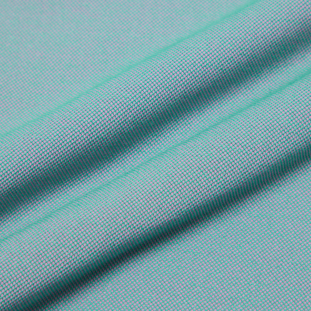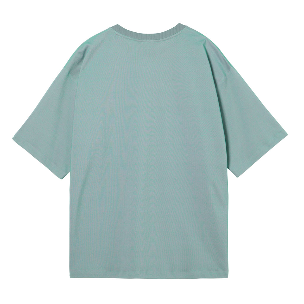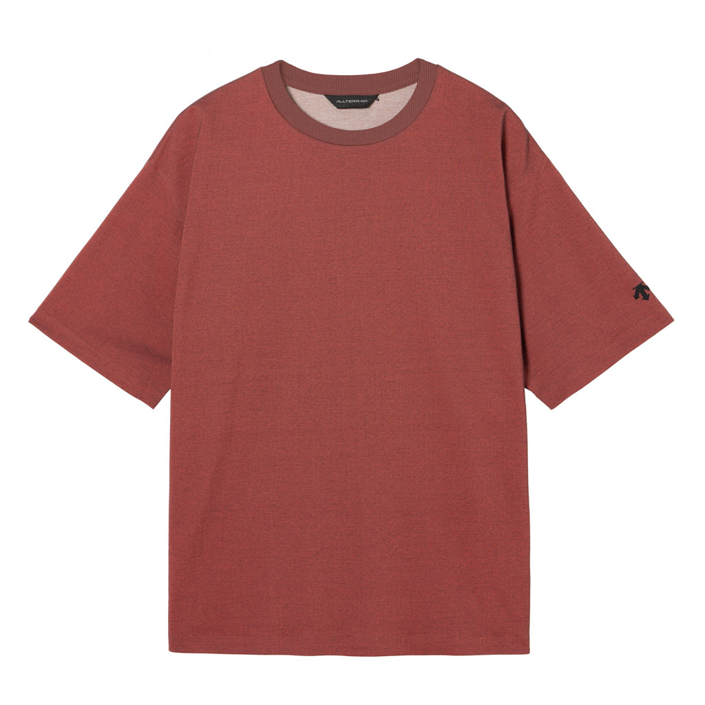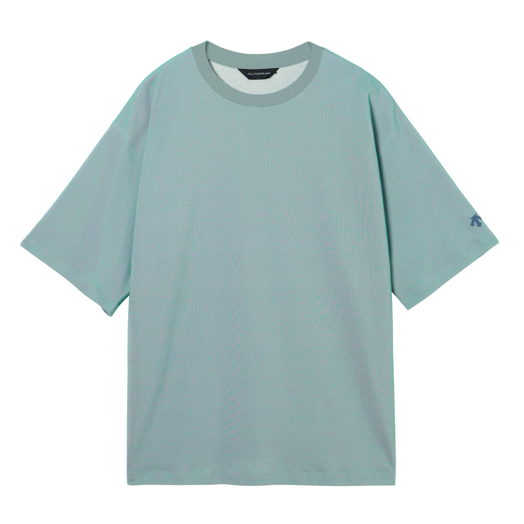 A short sleeve T-shirt combining heat shielding and UV blocking functional yarn with cotton. The proprietary fabric offers a natural cotton texture with stretch, and is quick-wicking and quick-drying. The piqué knit structure is comfortable in spring and summer. It has a dynamic chambray coloration that changes with movement, giving it visual depth. Ultrasonic processing and thermal bonding create a seamless design and improved skin comfort.