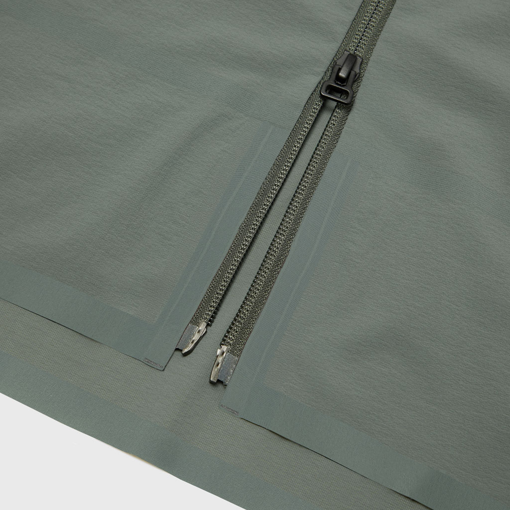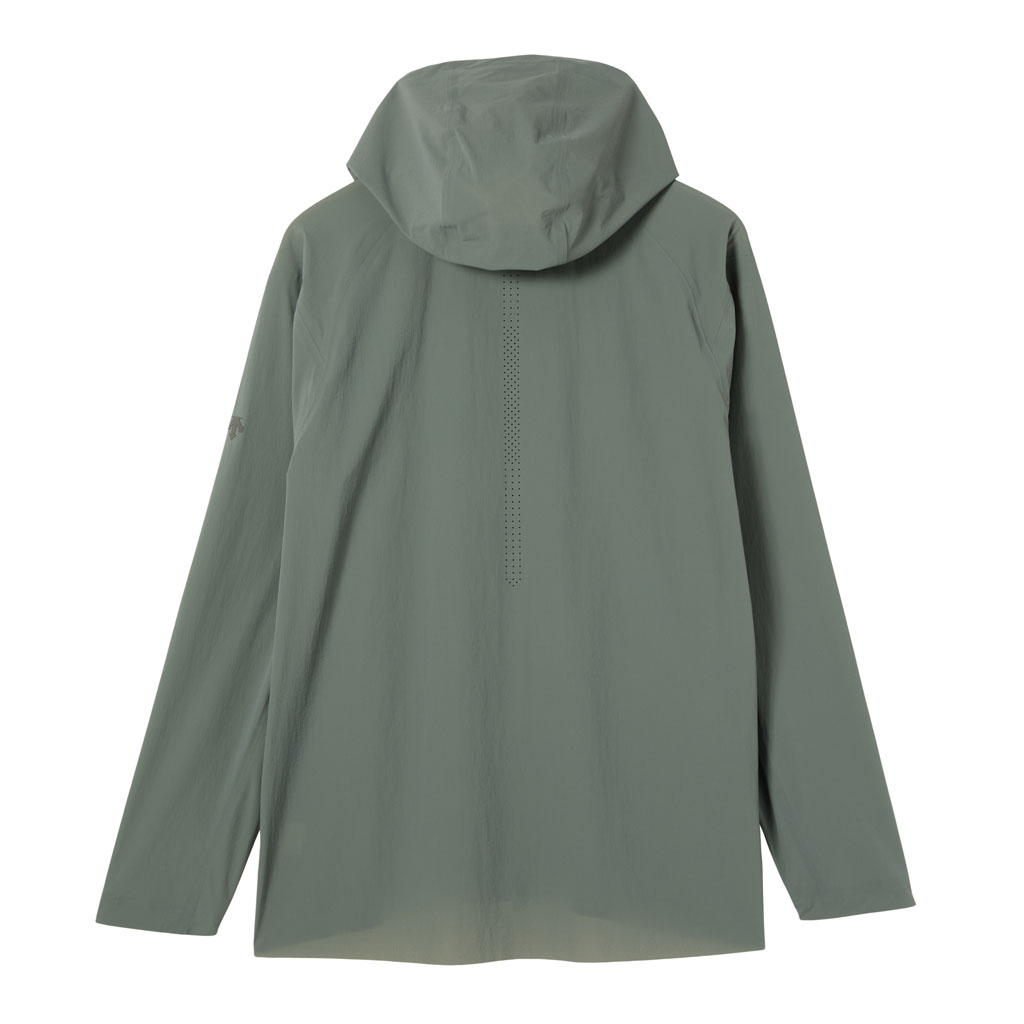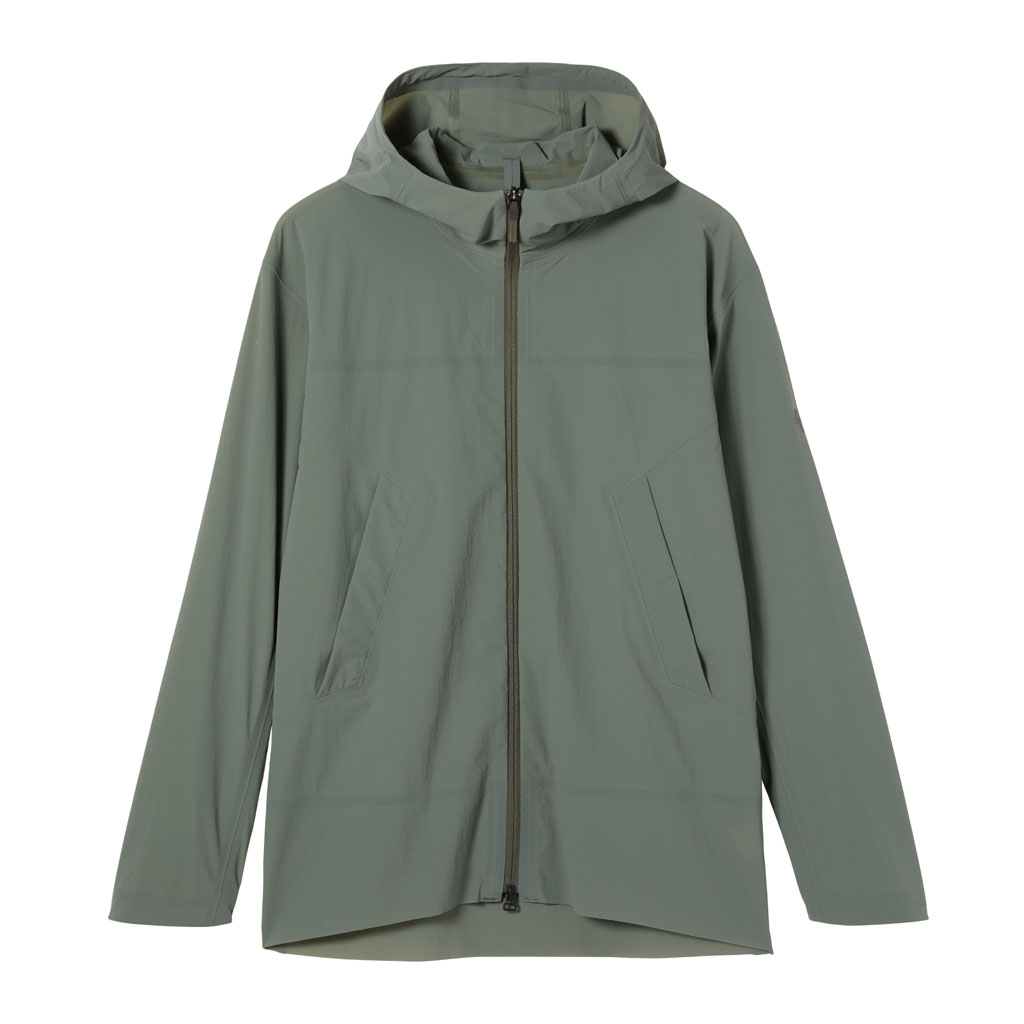 A hoodie jacket in a specially developed free-cut woven fabric with superior stretch and water-repellency. Ultrasonic seam welding reduces skin contact with stitching, and cut edges do not fray, enabling a minimalist, clean aesthetic. Ideal for unpredictable weather and temperature fluctuations.