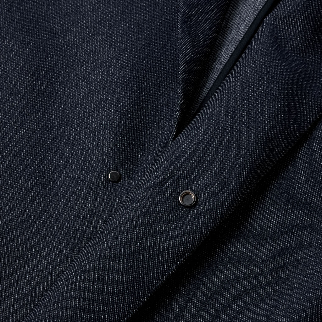 A tailored jacket in a 100% polyester denim-like material. Unlike traditional denim which is a weave of navy and white yarns, this is woven with navy and heathered yarns for a more refined appearance. The added water-repellent finish protects against sudden rain and ensures all day comfort and great versatility.