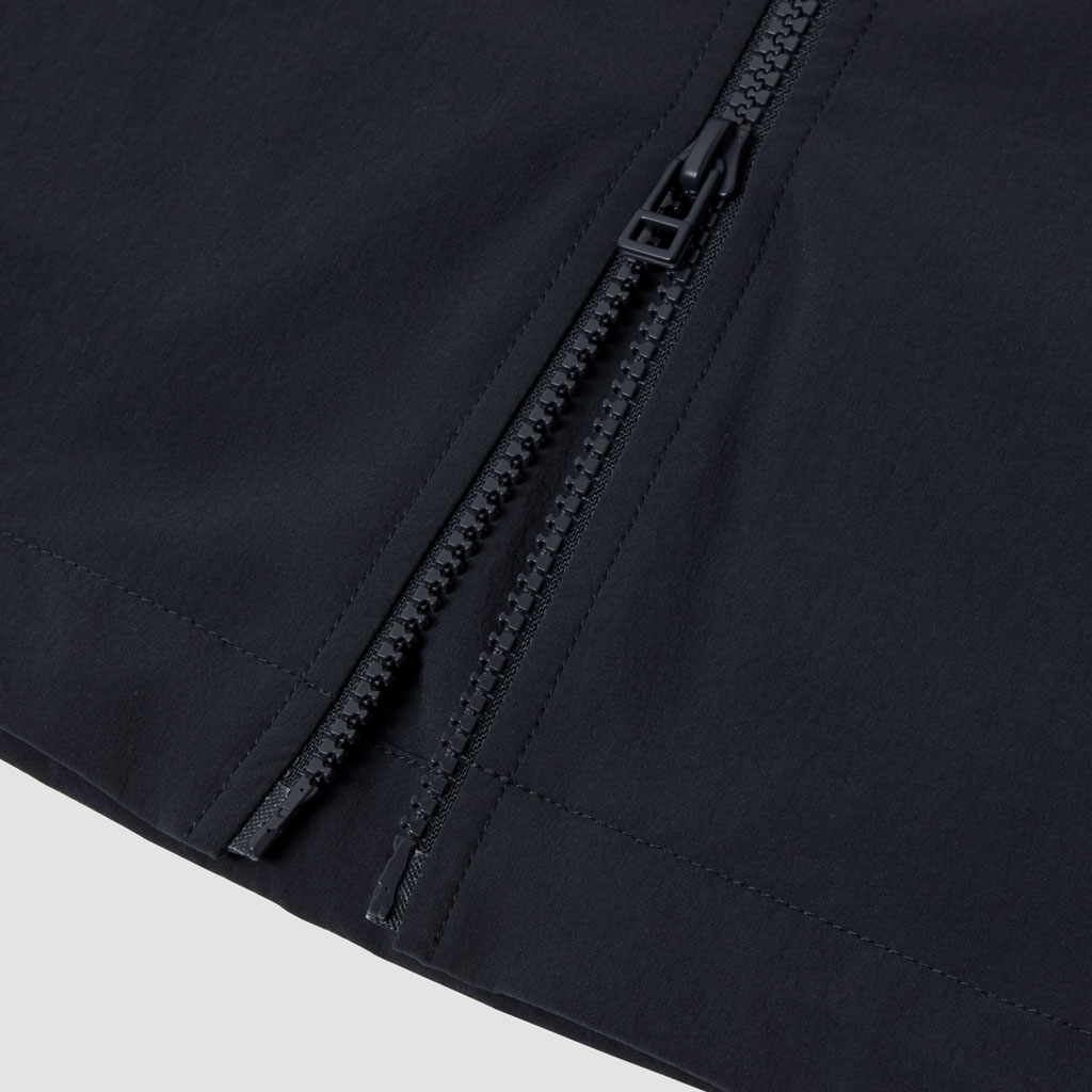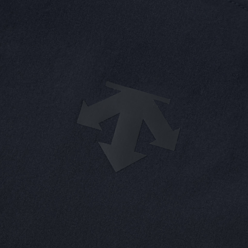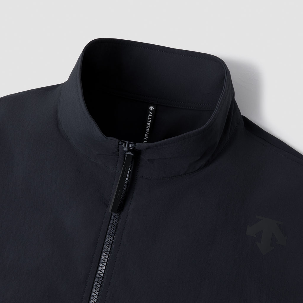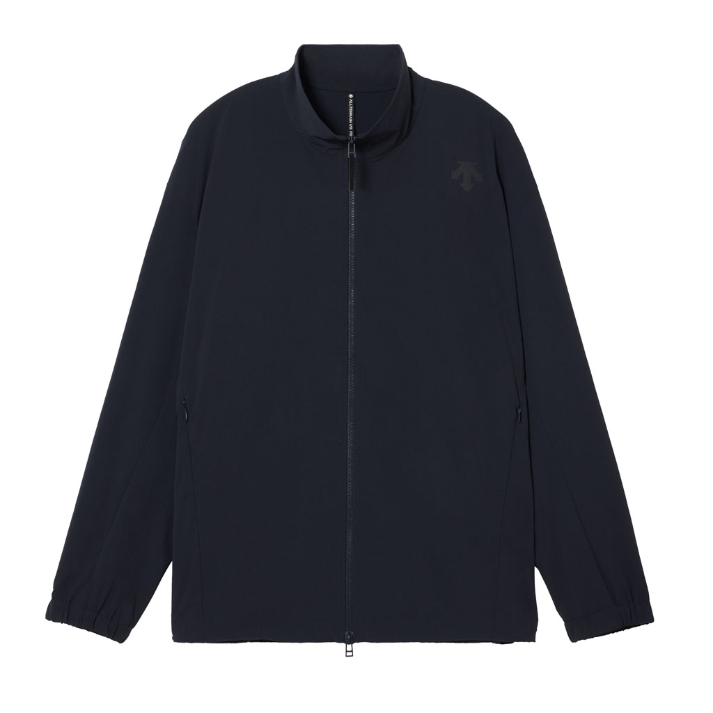 A lightweight track jacket in 4 way stretch, water repellent, recycled nylon. Ideal for everyday use with pattern engineering that maximizes freedom of movement. A slightly loose silhouette with elasticized hem and cuffs offers a comfortable fit. The design is minimalist but the addition of a large chest logo gives it modern sportswear appeal. It can be paired with the TRACK series pants in the same fabric.