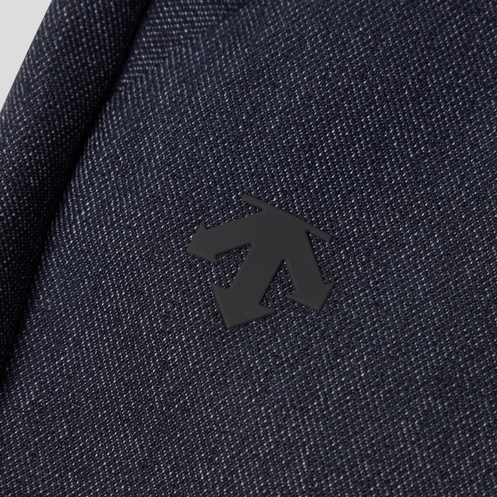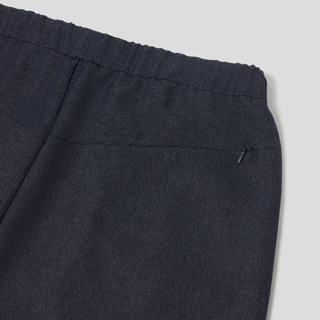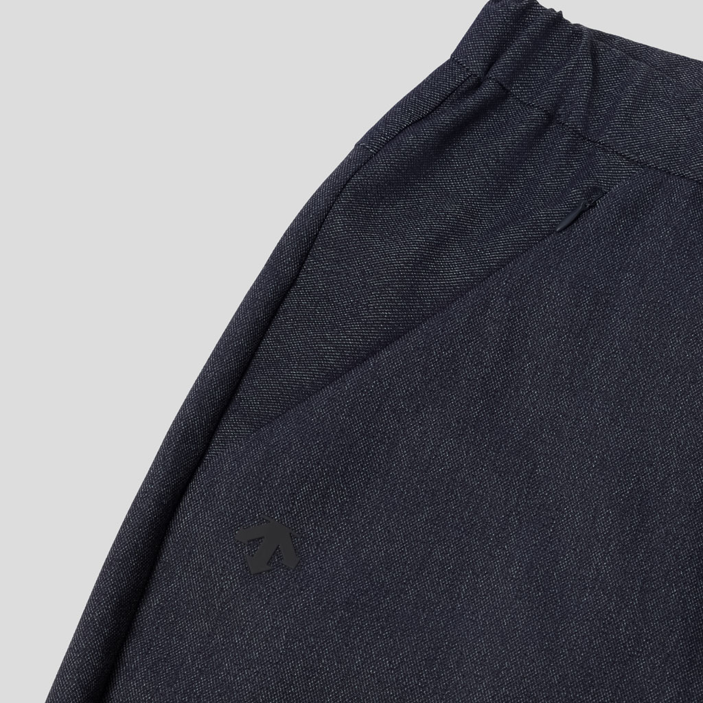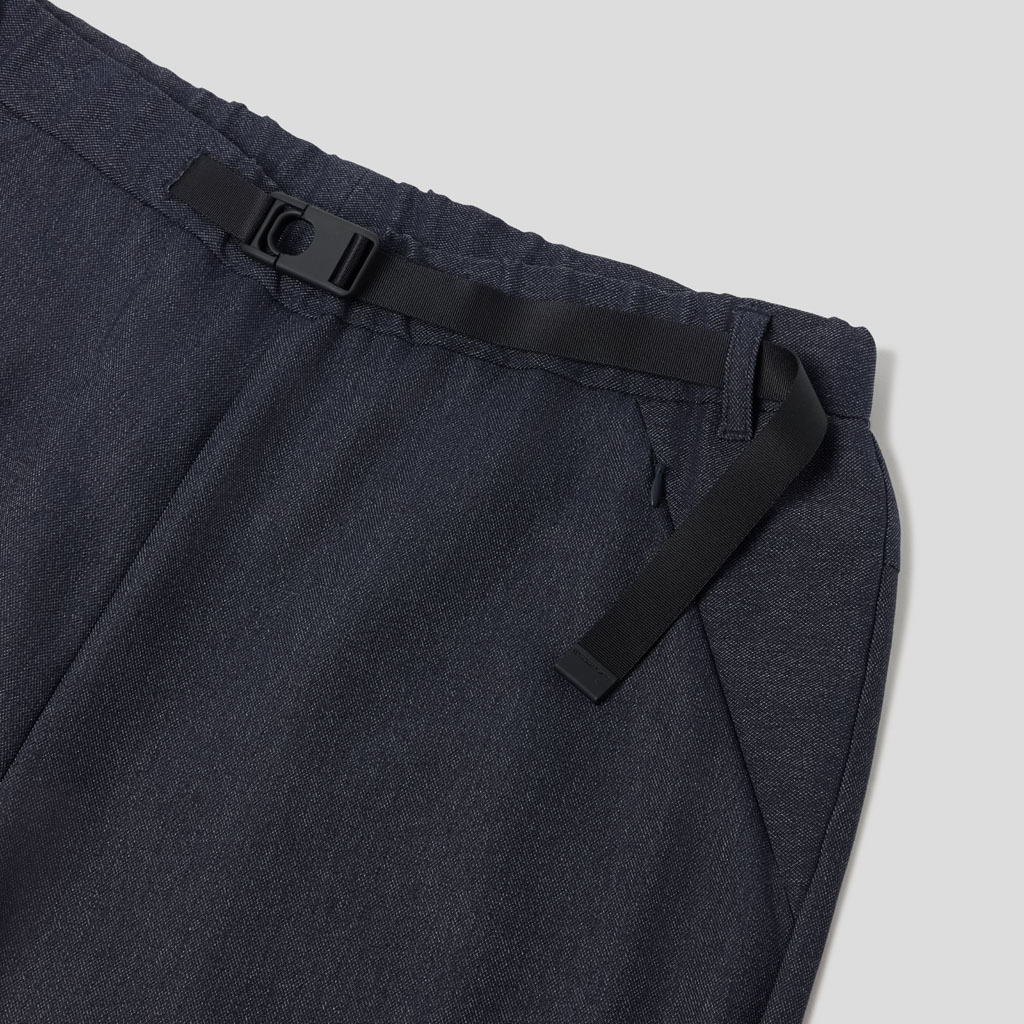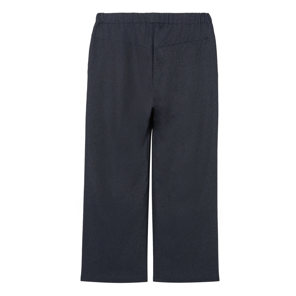 Wide cut pants in a 100% polyester denim-like material. Unlike traditional denim which is a weave of navy and white yarns, this is woven with navy and heathered yarns for a more refined appearance. The added water-repellent finish protects against sudden rain and ensures all day comfort and great versatility.