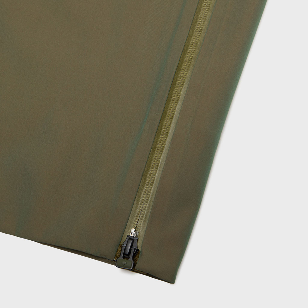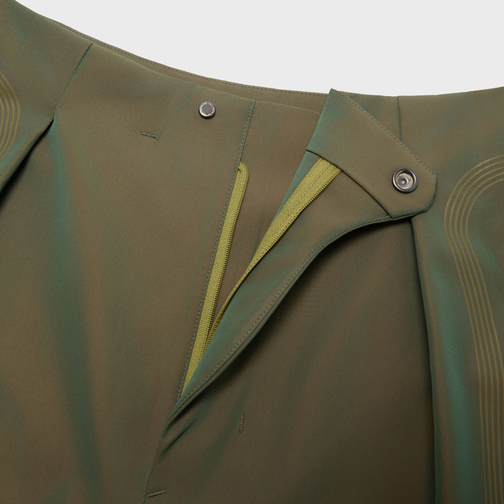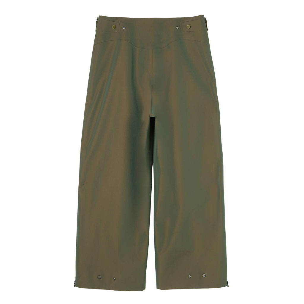 Hard shell pants in a lustrous chambray fabric, engineered with superior waterproofing and breathability. The dynamic color tone changes with movement, giving visual depth. Essentially wide silhouette overpants with relaxed tucks, creating a 3D effect. Both legs have DESCENTE’s Dual Ventilation System, with zipper adjustment enhancing ventilation when necessary. Streamline Technology around the hip pockets channels water away, keeping the area dry even in the rain. Snap buttons at the hem enable silhouette adjustment for various styling options. Rain pants reimagined.