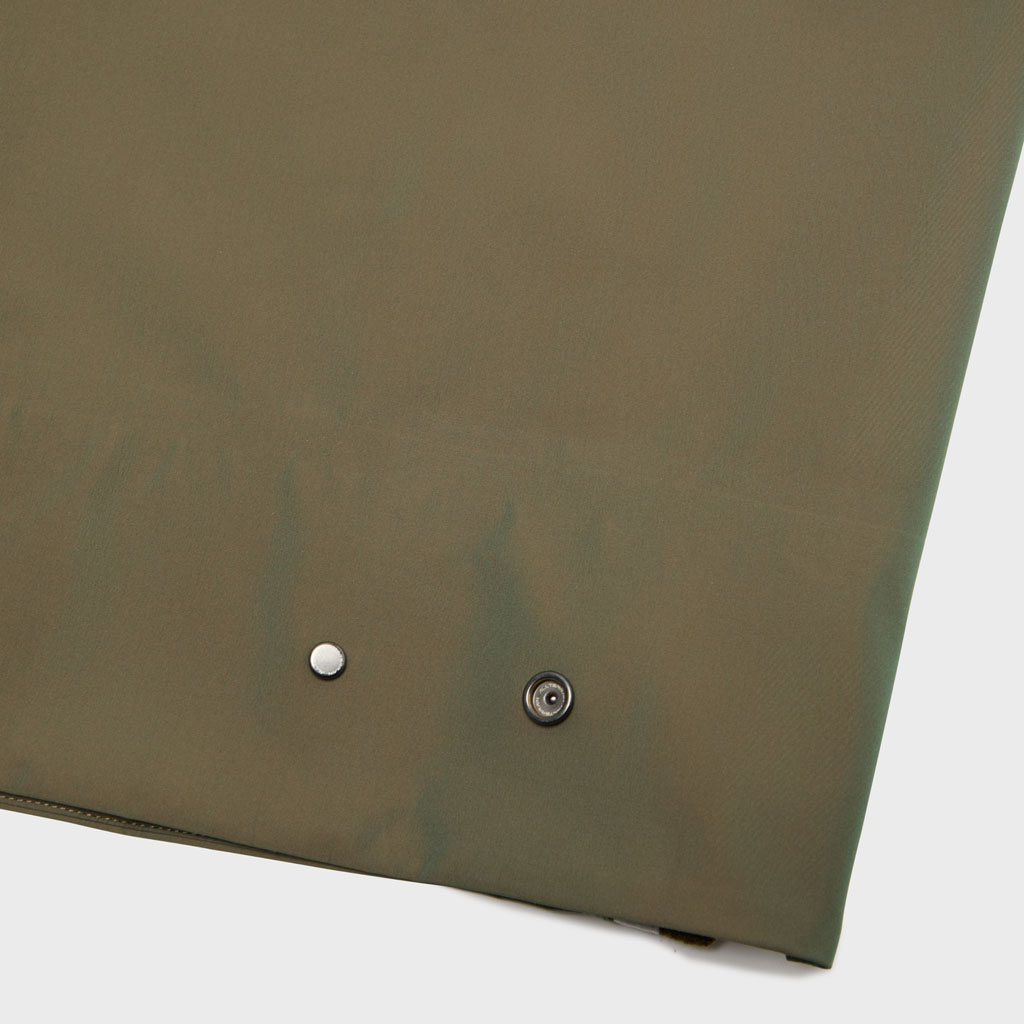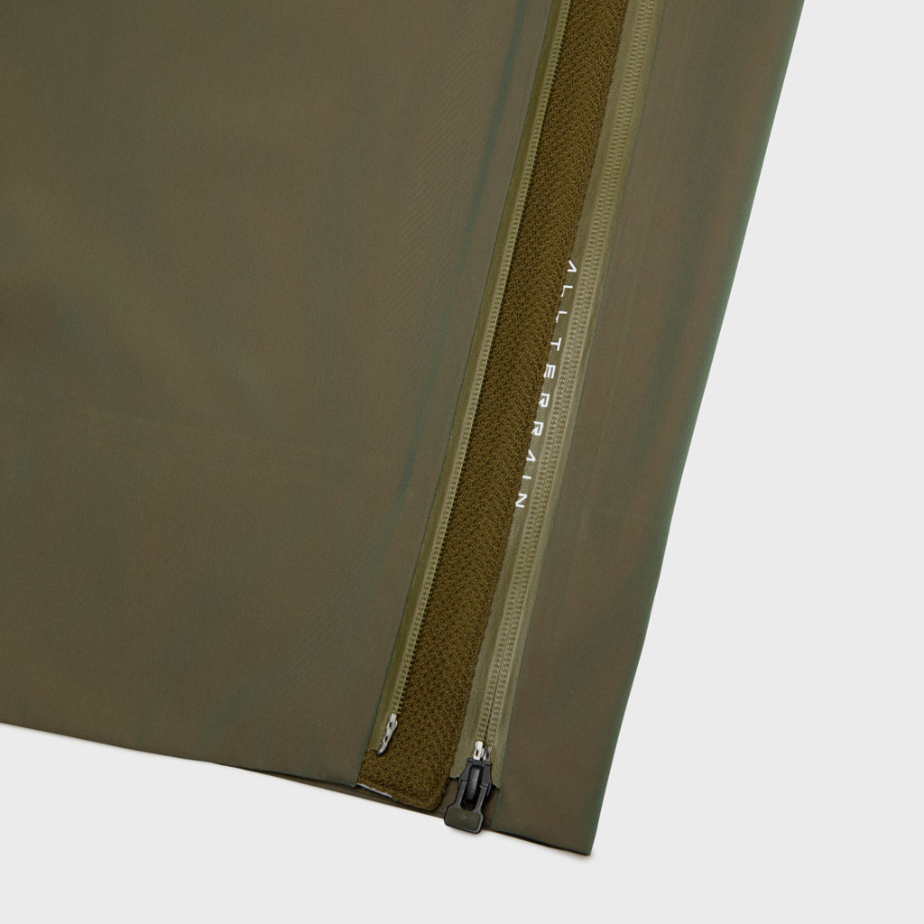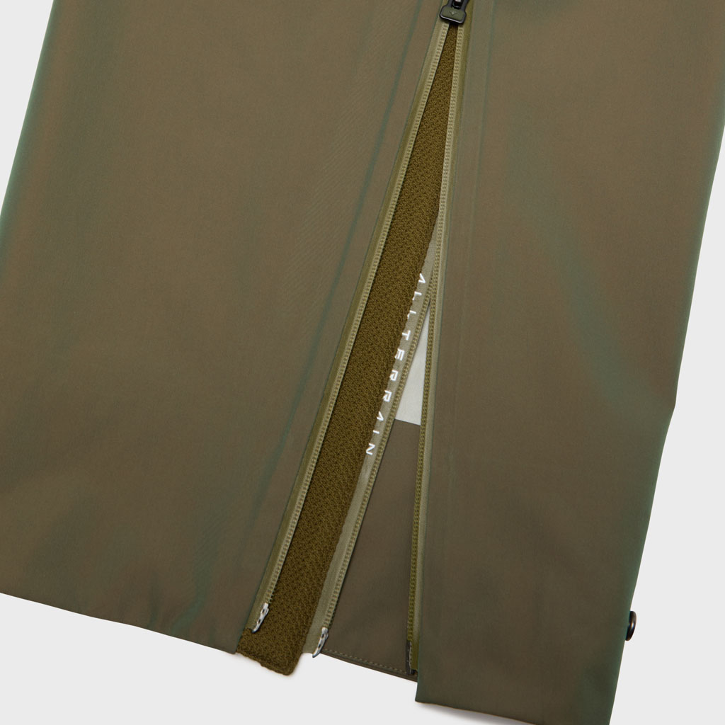 Hard shell pants in a lustrous chambray fabric, engineered with superior waterproofing and breathability. The dynamic color tone changes with movement, giving visual depth. Essentially wide silhouette overpants with relaxed tucks, creating a 3D effect. Both legs have DESCENTE’s Dual Ventilation System, with zipper adjustment enhancing ventilation when necessary. Streamline Technology around the hip pockets channels water away, keeping the area dry even in the rain. Snap buttons at the hem enable silhouette adjustment for various styling options. Rain pants reimagined.