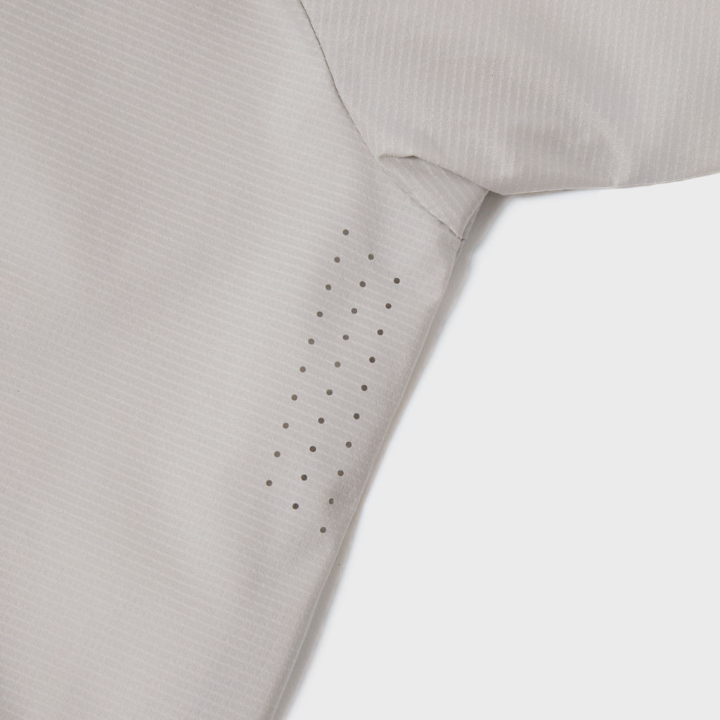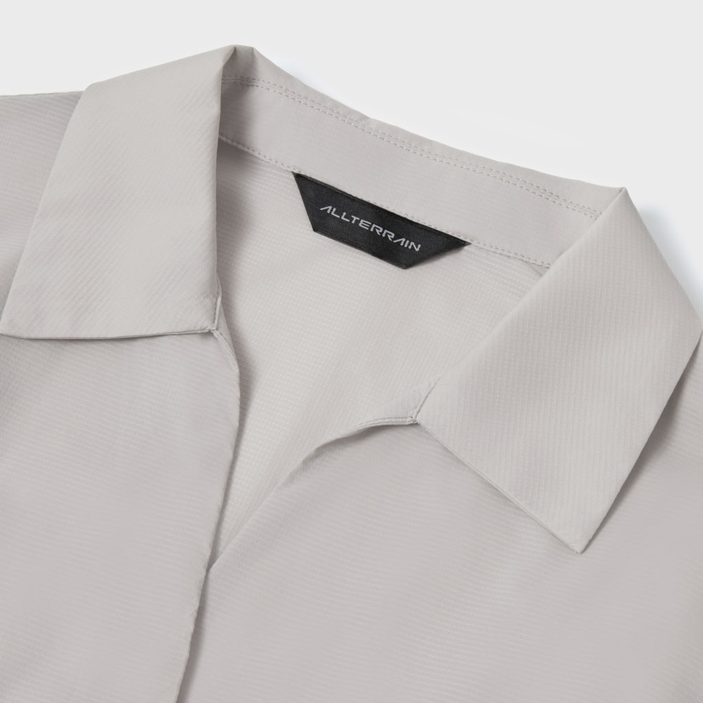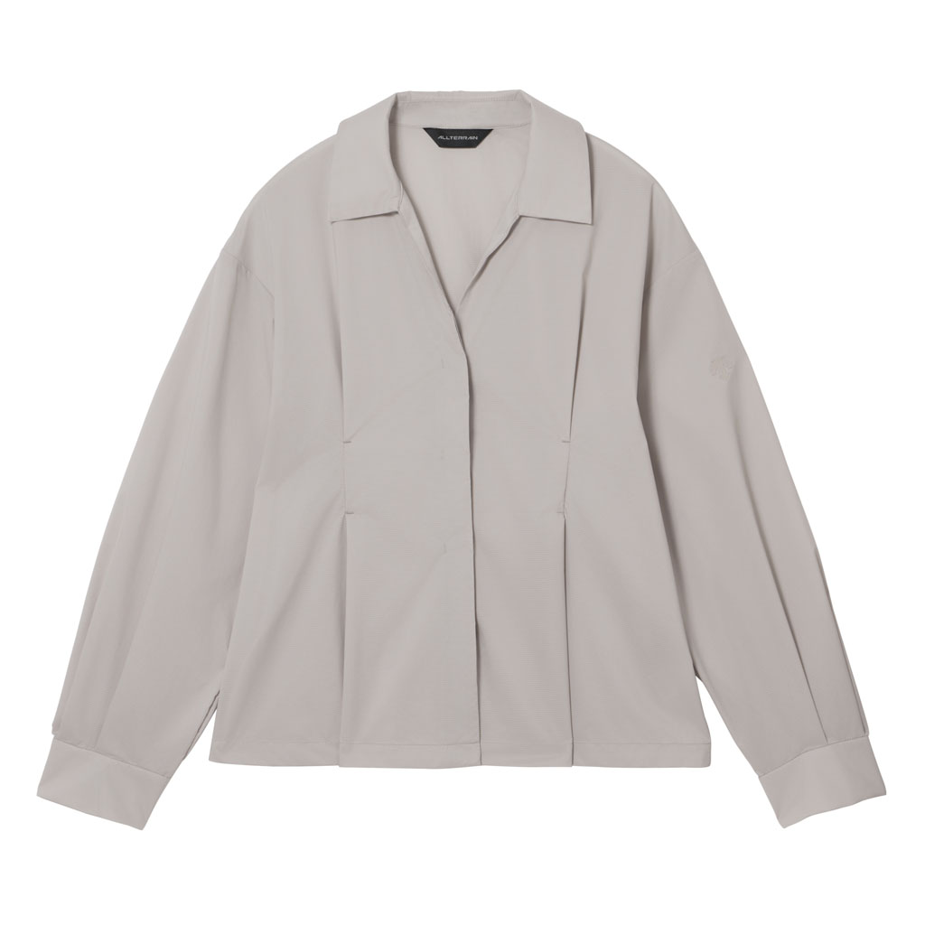 A long-sleeve skipper collar shirt in a sheer fabric with water repellency and breathability. Tucks at the front and back of the waist give a structured look and promote internal airflow. Laser-cut underarm perforations support ventilation and the skipper collar enhances comfort with a polished, feminine look.