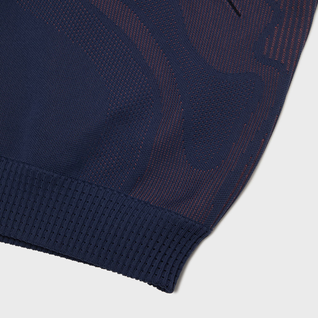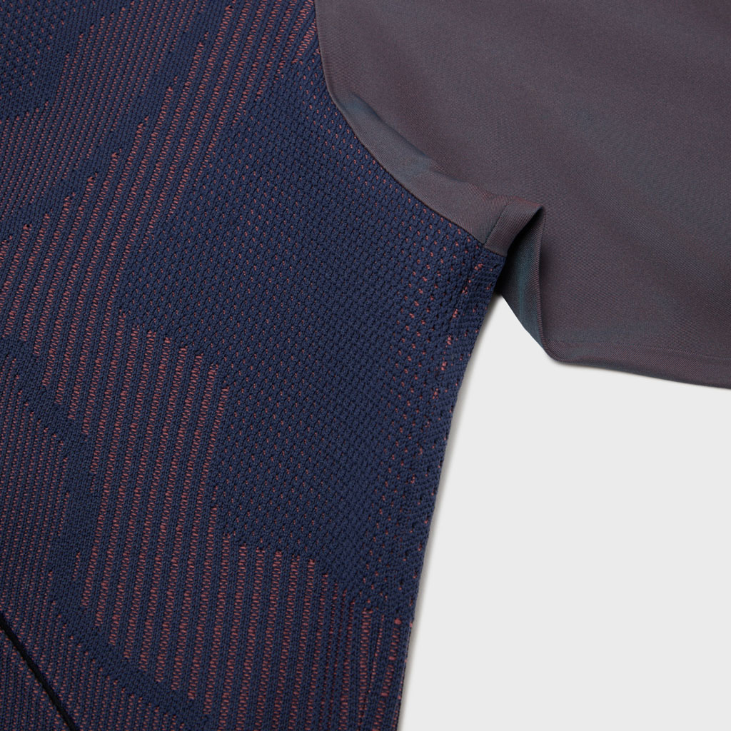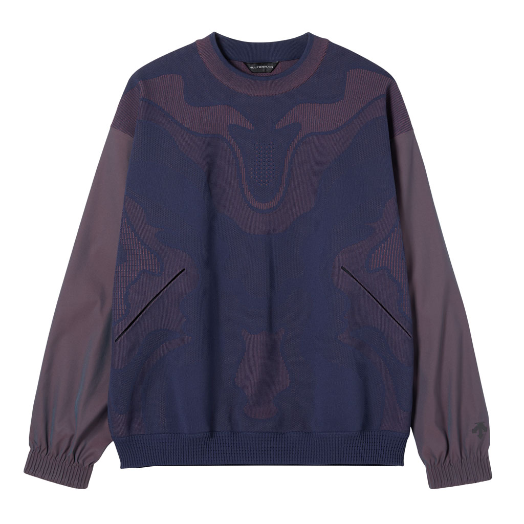 A hybrid crewneck in the Fusionknit series with a body mapping-inspired knit pattern. Various jacquard patterns are knitted into a single fabric piece for thermal comfort and seamless stretch in the front and back. The sleeves are in woven fabric for design impact and abrasion resistance. DESCENTE’s original pattern engineering creates a 3D silhouette with an enveloping fit. A combination of knit-and-sew garment manufacture, ultrasonic processing and thermal bonding creates a seamless design for maximum freedom of movement and comfort.