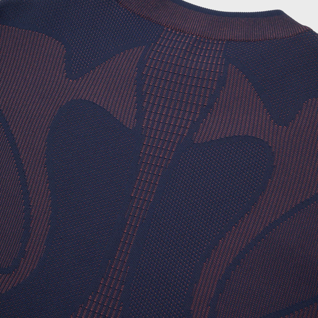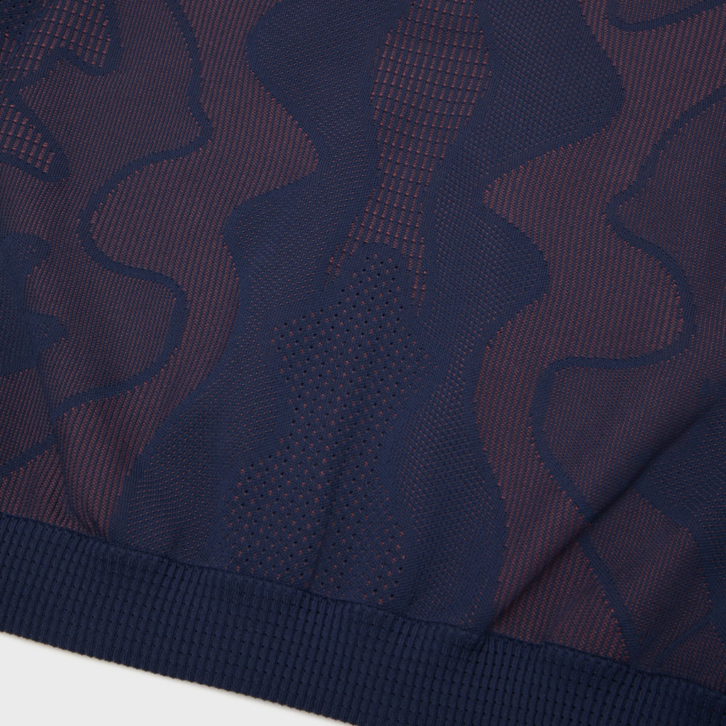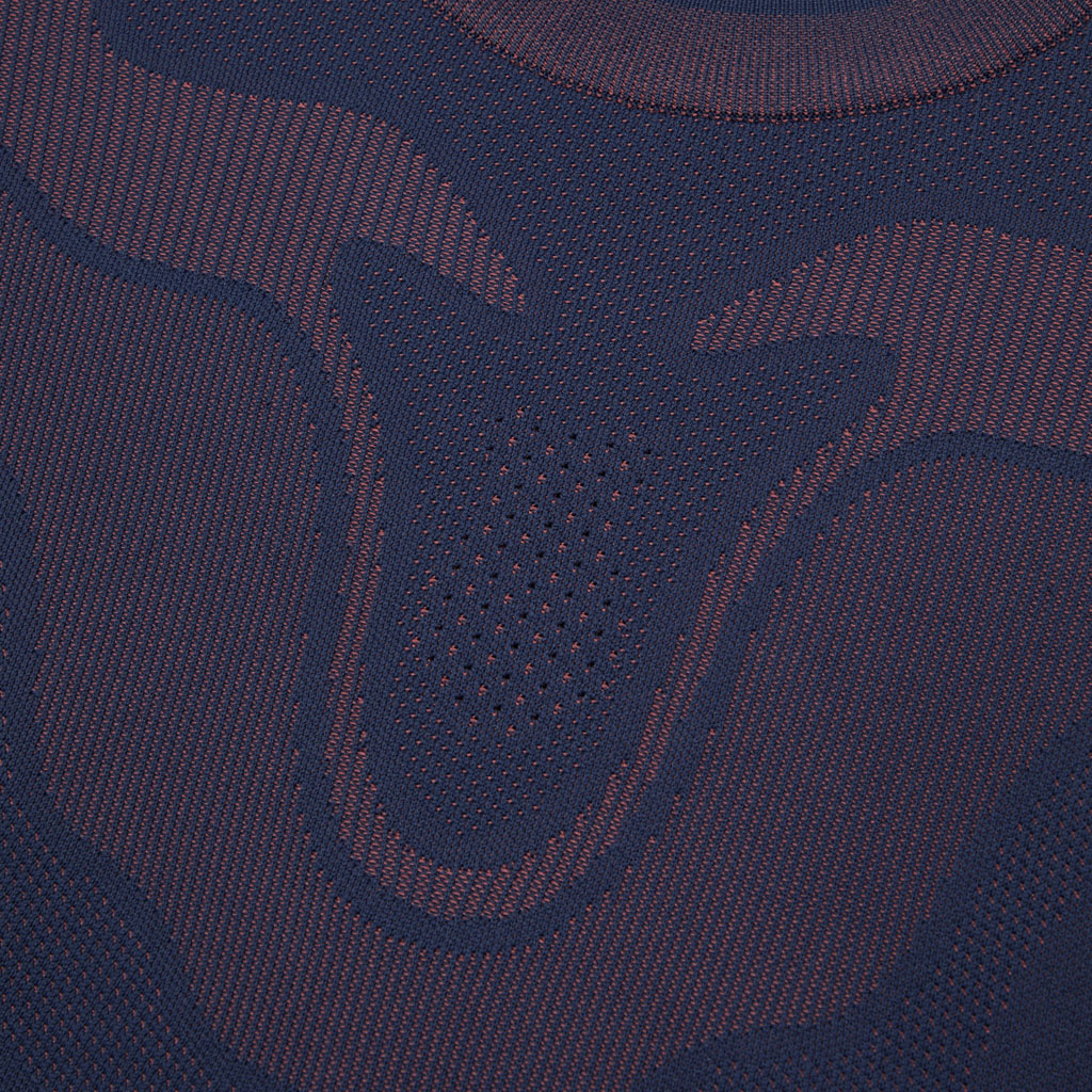 A hybrid crewneck in the Fusionknit series with a body mapping-inspired knit pattern. Various jacquard patterns are knitted into a single fabric piece for thermal comfort and seamless stretch in the front and back. The sleeves are in woven fabric for design impact and abrasion resistance. DESCENTE’s original pattern engineering creates a 3D silhouette with an enveloping fit. A combination of knit-and-sew garment manufacture, ultrasonic processing and thermal bonding creates a seamless design for maximum freedom of movement and comfort.
