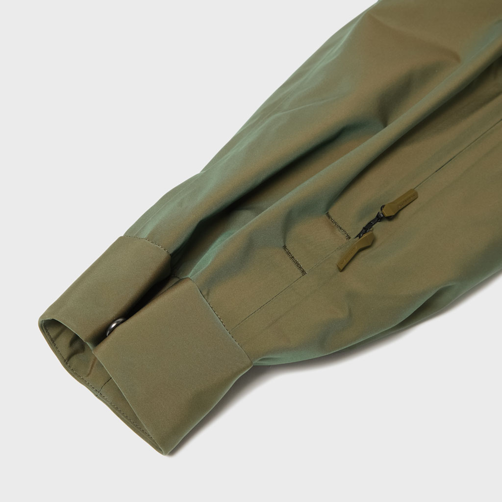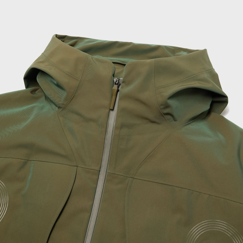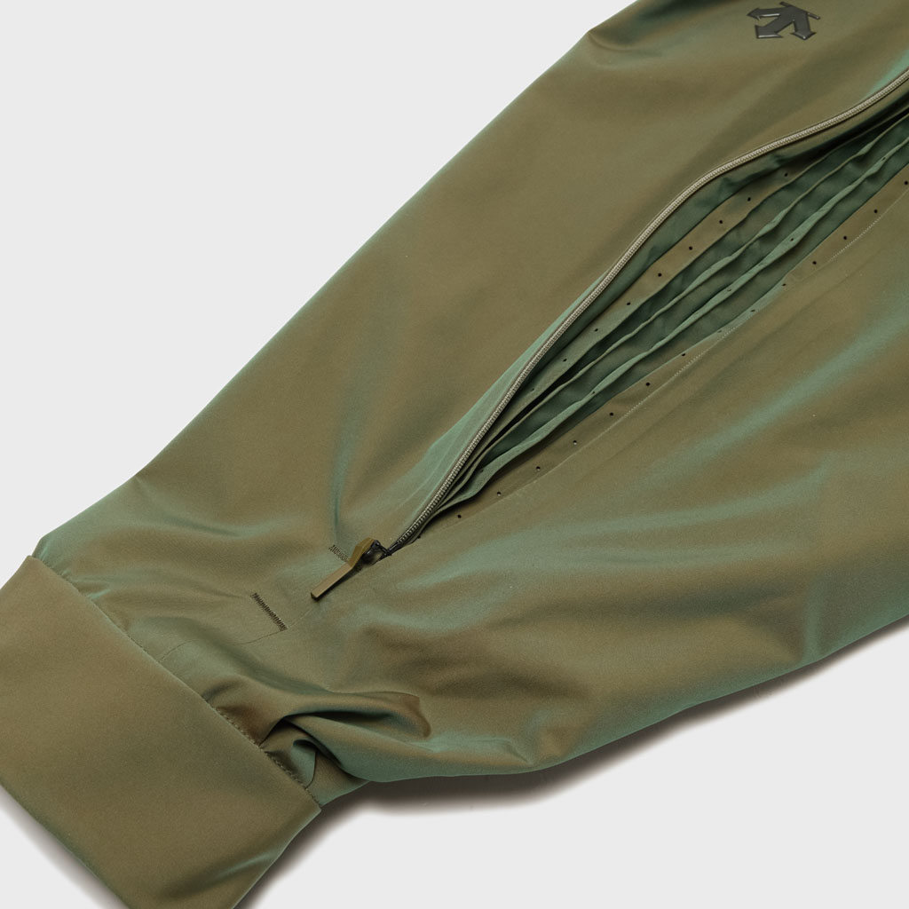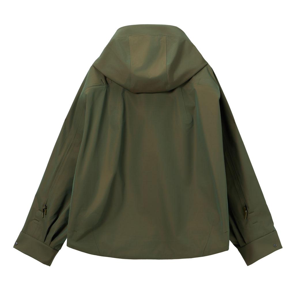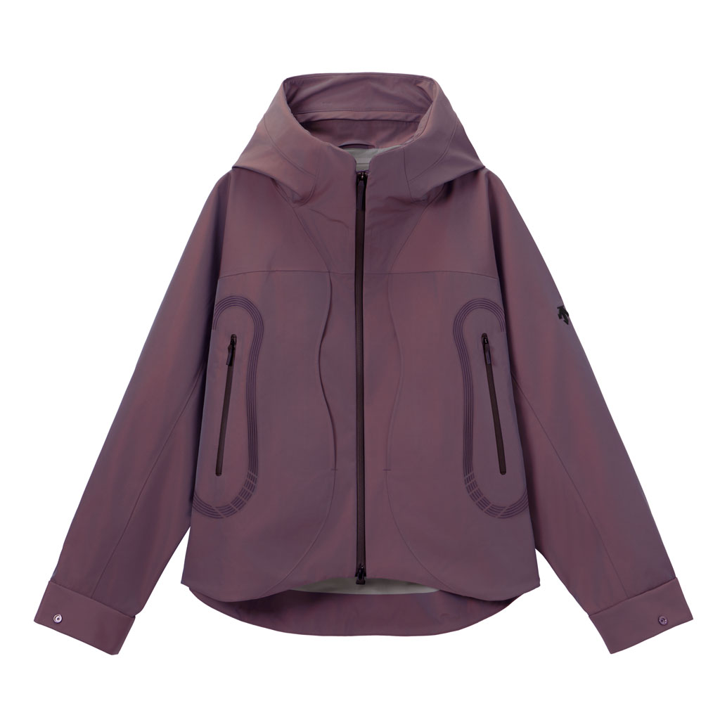 A hard shell jacket in a lustrous chambray fabric, engineered with superior waterproofing and breathability. It has a dynamic color tone that changes with movement, giving it visual depth. The short overall length and voluminous body and sleeves give it a rounded, 3D silhouette allowing better air circulation. Airflow is further enhanced by ventilation zippers on the back of the sleeves. When opened, internal pleats with laser-cut holes expand, releasing heat through the widened sleeves. DESCENTE’s unique Dual Ventilation System is used in the front. Two rows of zippers with mesh between them bring in outside air to promote active ventilation. In wet weather the Parahood System prevents water from pooling in the hood and Streamline Technology channels water away from chest pockets. Snap buttons at the cuffs and the Cohaesive® system at the hem allow silhouette adjustment to offer styling options. The rain jacket reimagined.
