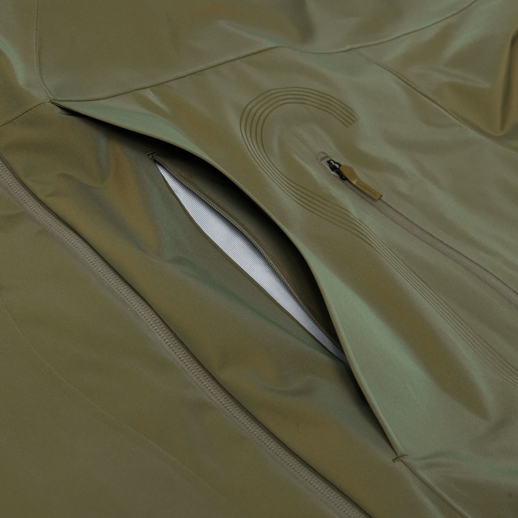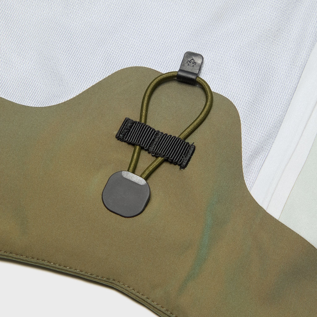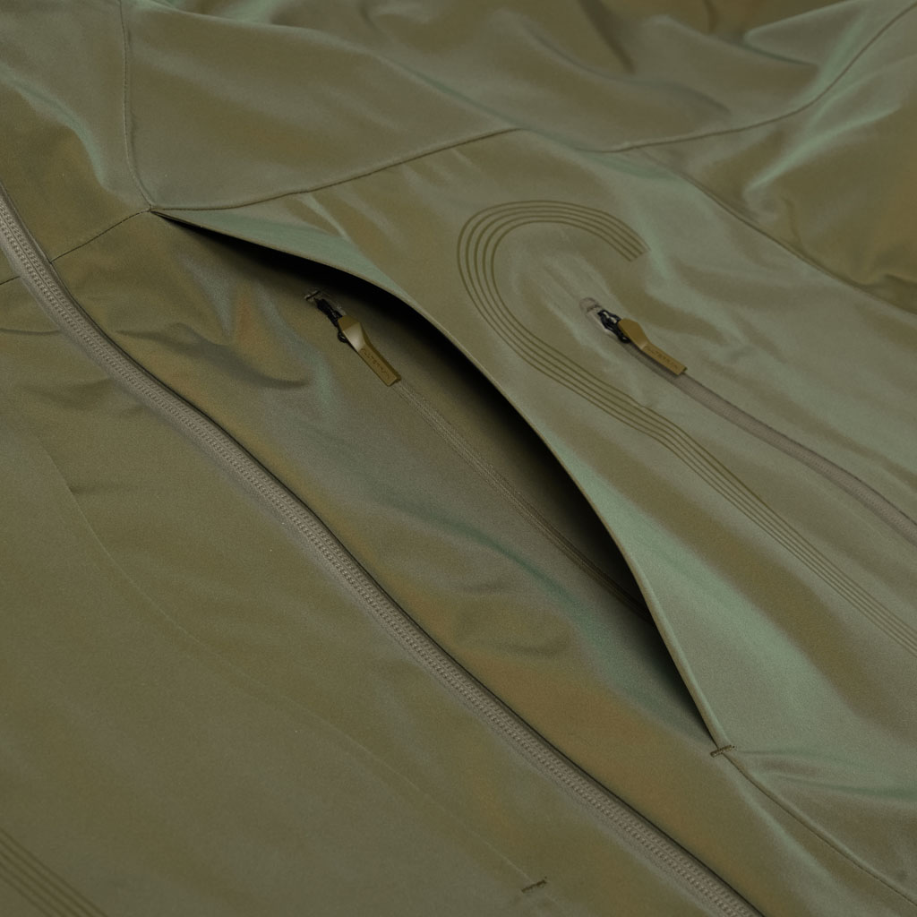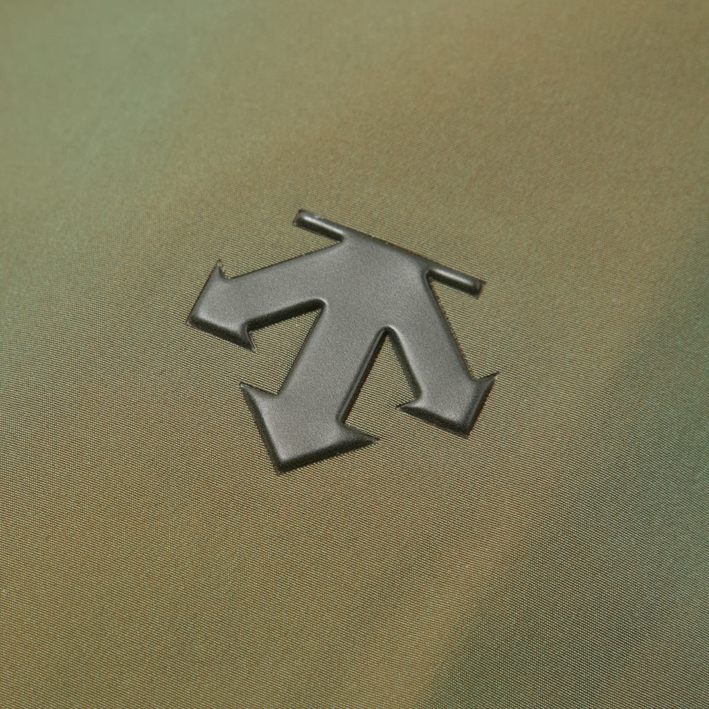 A hard shell jacket in a lustrous chambray fabric, engineered with superior waterproofing and breathability. It has a dynamic color tone that changes with movement, giving it visual depth. The short overall length and voluminous body and sleeves give it a rounded, 3D silhouette allowing better air circulation. Airflow is further enhanced by ventilation zippers on the back of the sleeves. When opened, internal pleats with laser-cut holes expand, releasing heat through the widened sleeves. DESCENTE’s unique Dual Ventilation System is used in the front. Two rows of zippers with mesh between them bring in outside air to promote active ventilation. In wet weather the Parahood System prevents water from pooling in the hood and Streamline Technology channels water away from chest pockets. Snap buttons at the cuffs and the Cohaesive® system at the hem allow silhouette adjustment to offer styling options. The rain jacket reimagined.