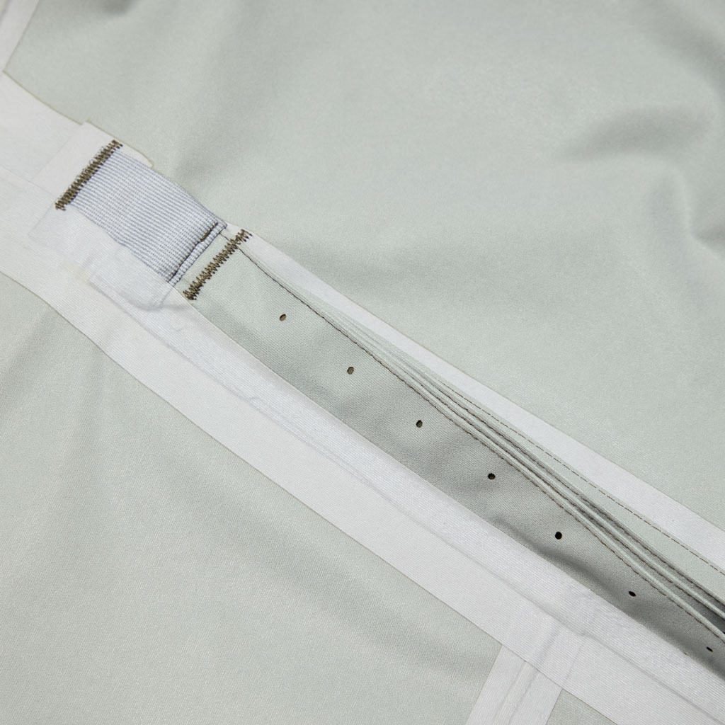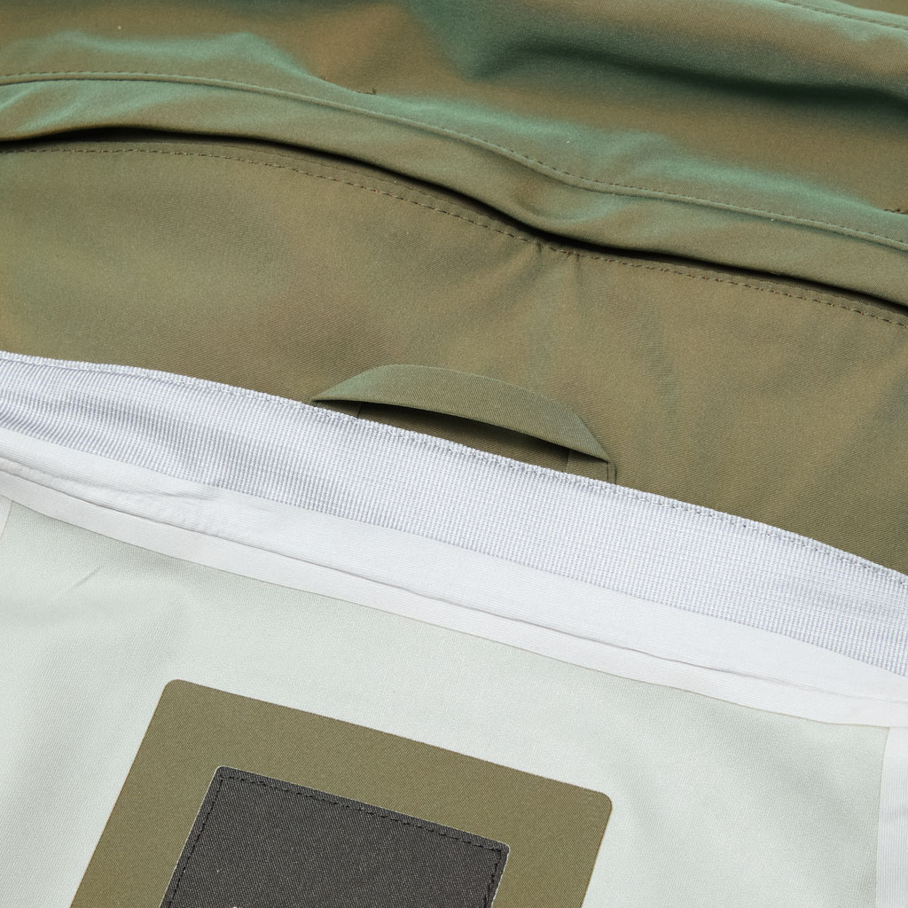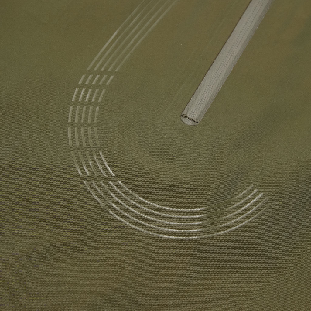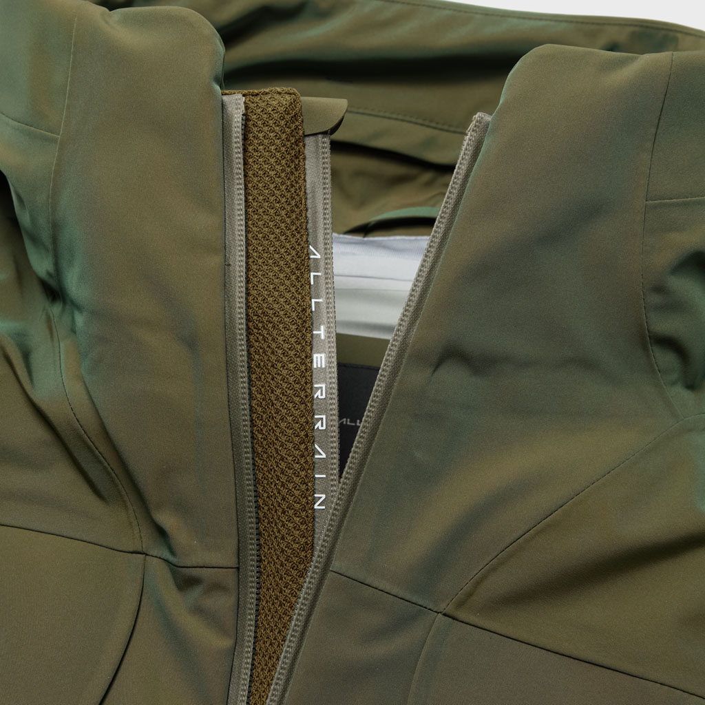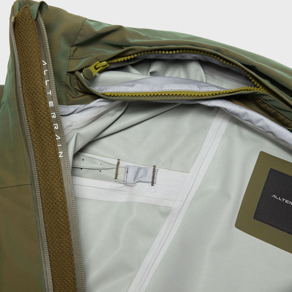 A hard shell jacket in a lustrous chambray fabric, engineered with superior waterproofing and breathability. It has a dynamic color tone that changes with movement, giving it visual depth. The short overall length and voluminous body and sleeves give it a rounded, 3D silhouette allowing better air circulation. Airflow is further enhanced by ventilation zippers on the back of the sleeves. When opened, internal pleats with laser-cut holes expand, releasing heat through the widened sleeves. DESCENTE’s unique Dual Ventilation System is used in the front. Two rows of zippers with mesh between them bring in outside air to promote active ventilation. In wet weather the Parahood System prevents water from pooling in the hood and Streamline Technology channels water away from chest pockets. Snap buttons at the cuffs and the Cohaesive® system at the hem allow silhouette adjustment to offer styling options. The rain jacket reimagined.